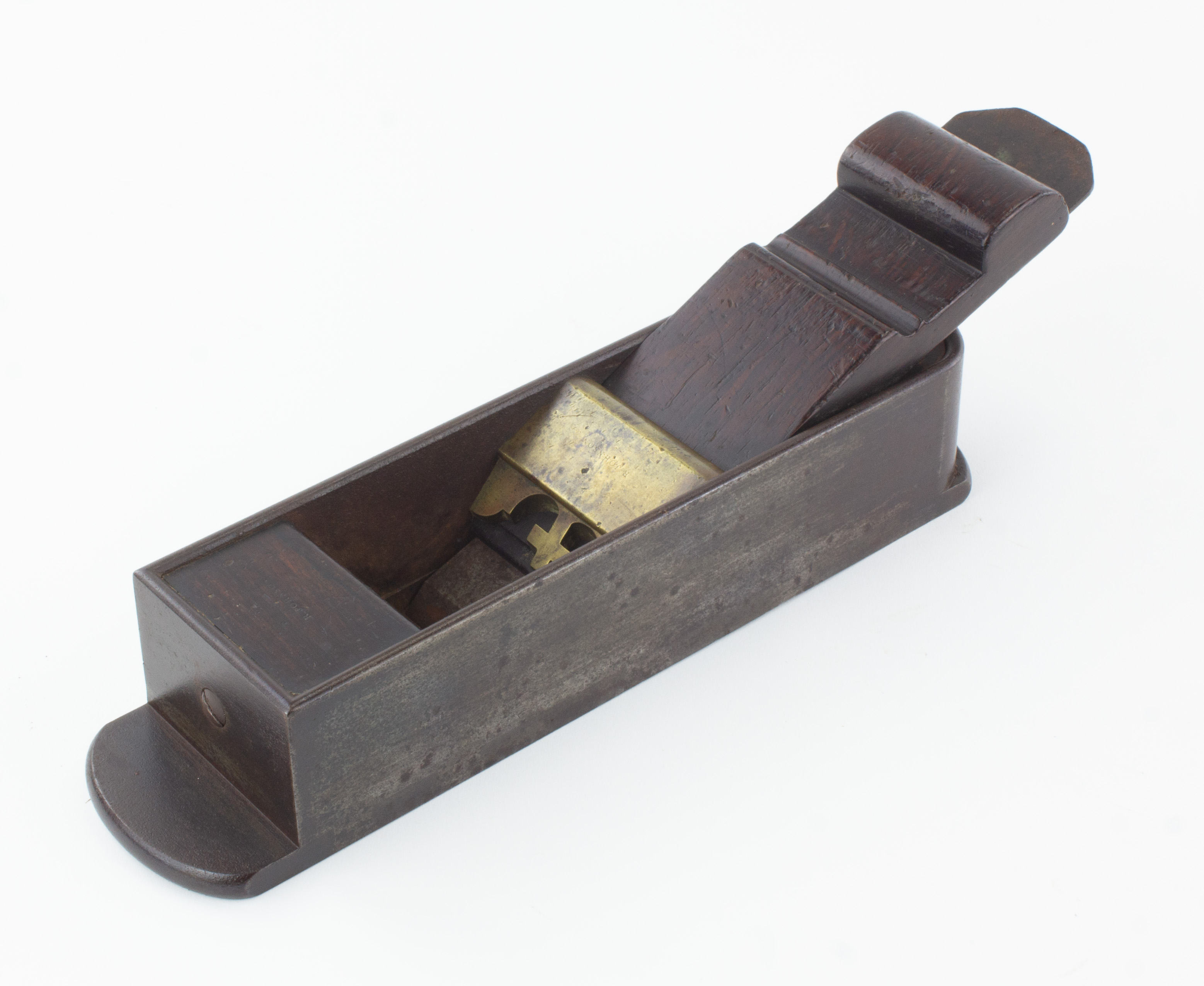 B67-148 INFILL MITRE PLANE. 10" dovetailed sole, rosewood fill and wedge, 2" unmarked iron. Has brass bridge stamped R. Johnson with unusual decorative cross motif. Metal uniformly oxidized with a few patches of light pitting on sole, wood has a few scrapes but no damage and also stamped with Johnson's name. Well made and unique. Good+ 500-750