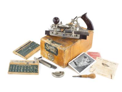 B67-150 COMBINATION PLANE. Stanley No. 45 IOB. Has script mark on skate, appears to include all parts and two cutter sets in original boxes with good labels, original instruction booklet, price list, and cam stop sheet. Pasteboard box has one split seam on lid, some wear, and 85% label. Nickel nearly complete with some loss along skate edge, wood nice and clean. Good+ 200-400