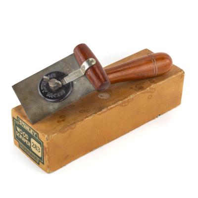 B67-153 SCRAPER. Stanley No. 283 IOB. Wood and metal both fine, includes intact waxed paper and instruction sheet. Box has a few stains on lid and mild wear, complete label. From the collection of Harold Unruh. Fine 150-300
