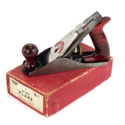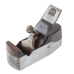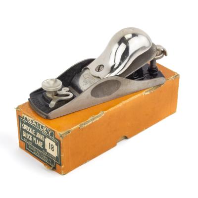B67-160 KNUCKLE JOINT BLOCK PLANE. Stanley No. 18 IOB. Later type with sweetheart mark on lever cap and cutter, japanning and nickel fully intact with a few spots of light oxidation. Box intact with original waxed paper and good label. Good+ 50-100