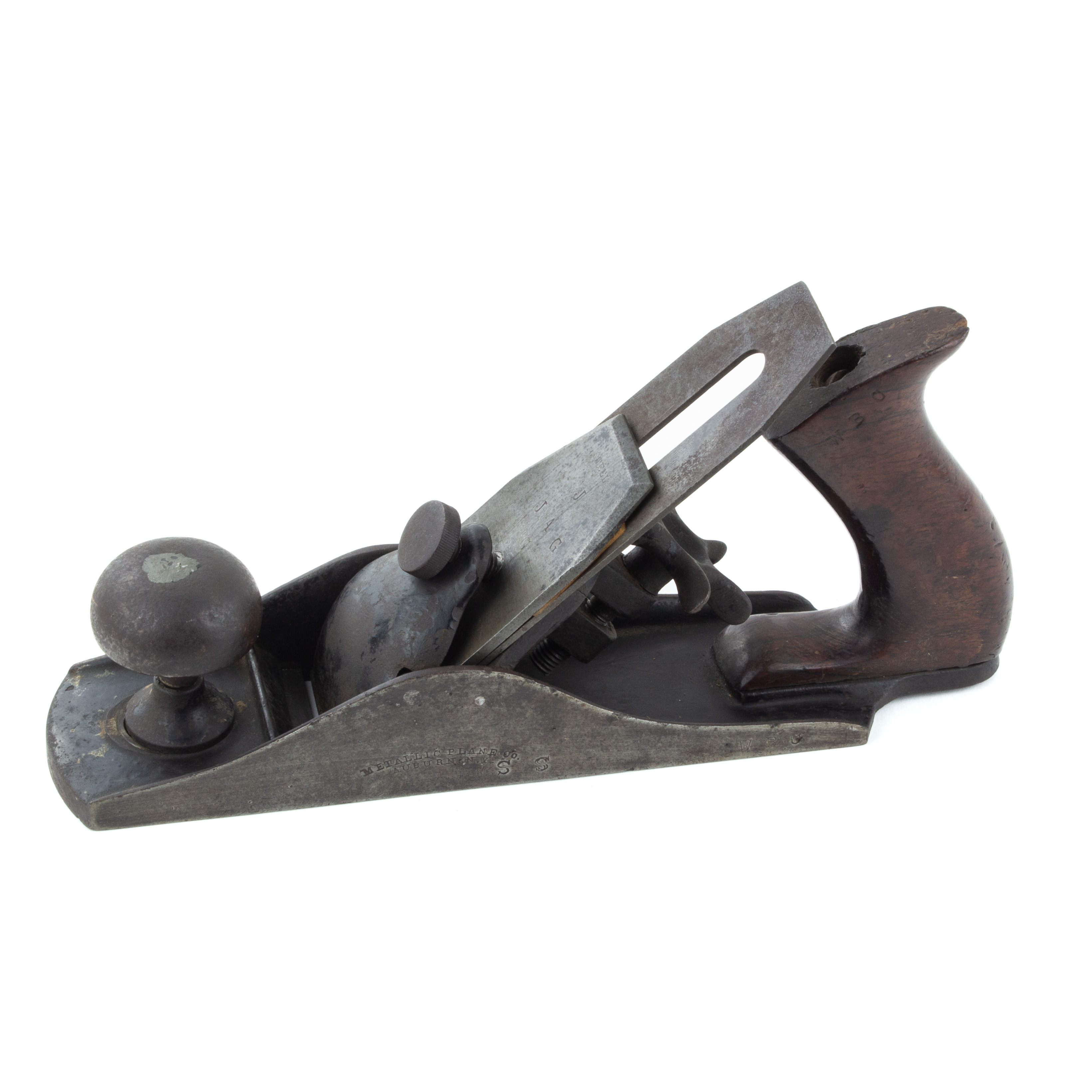 B67-181 SMOOTHING PLANE. Metallic Plane Co. Palmer & Storke patent stamped on cheek, faucet type adjustment knob, identical to plane shown in Fig. 210 in PTAMPIA I. Japanning 70%, overall oxidation to metal, horn on tote has small chip from end, user initials stamped into side. From the collection of Harold Unruh. Good 125-250