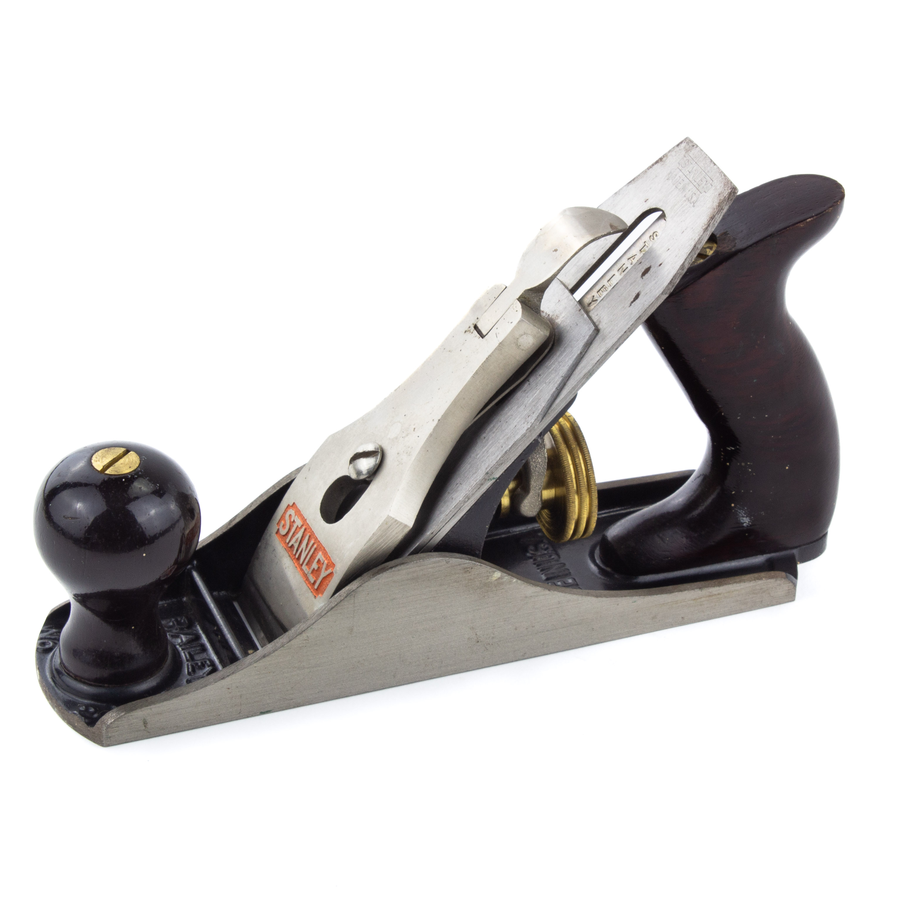 B67-183 NUMBER TWO SIZE PLANE. Stanley Extra-Long No. 2. For the last production run of the No. 2 in 1955 Stanley decided, apparently just for the heck of it, to add an extra inch to the sole, making it 8 inches. Wood and metal very clean, japanning 99%, notched rectangle cutter and kidney lever cap, orange paint intact. Super nice example. Fine 300-600