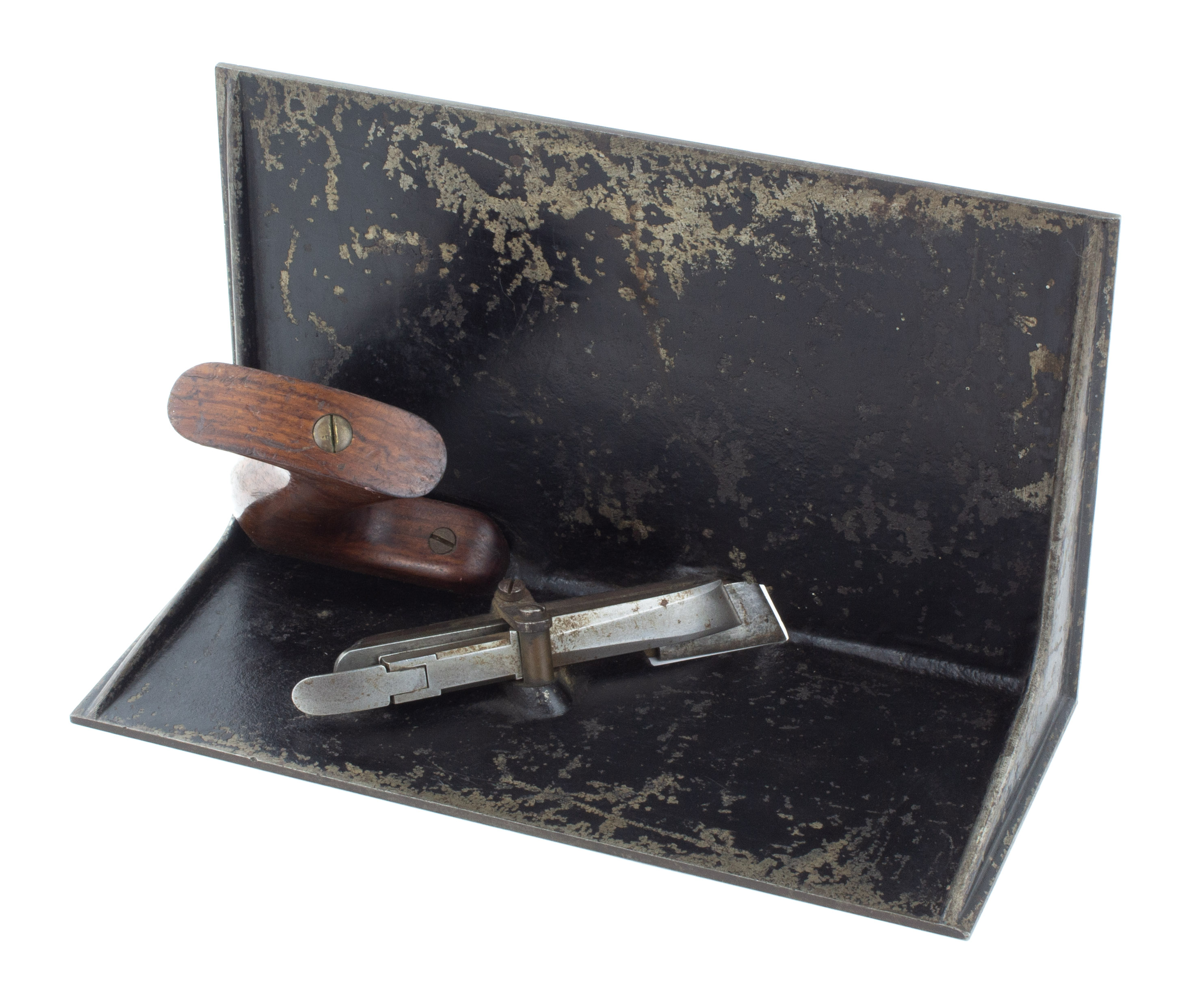 B67-193 CORE BOX PLANE. Unmarked and looks manufactured but unsure who made it. 10-3/4" sole, has 6-3/8" and 4-1/2" wings, good rosewood tote. Nickel plated lever cap, unmarked cutter. Japanning 60%. Has hole in 4" wing where the lever cap attaches. From the collection of Harold Unruh. Good 100-200