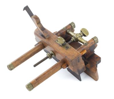 B67-199 UNHANDLED THREE ARM PLOW PLANE. Looks British and marked Wm. Tindal which appears to be a user name. Beech body with brass center arm with large brass thumbscrew, outer arms are wedged with brass tips, two of the tips are loose. One wedge has broken finial, body has overall stains and scrapes but no major damage. Ibbotson No. 7 cutter. Unusual. From the collection of Paul Van Pernis. Good 300-600