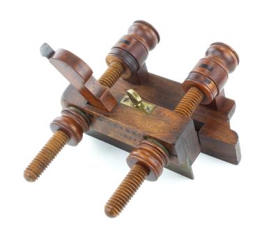 B67-202 SCREW-ARM PLOW PLANE. E.W. Carpenter. Very clean example of Carpenter's revolutionary 1838 patent. The rosewood oversized nuts, almost always found chipped, are in immaculate condition. Toe stamped with the early D mark. Unhandled beech body, very clean with a few stains and prominent user name on both cheeks. Good 750-1500