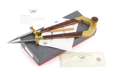 B67-211 MODERN MAKER. Bridge City No. DC-40 Dividing Compass IOB. No. 401 in the series with original certificate of authenticity. Brass and rosewood body, a few tiny spots of tarnish on brass but otherwise like new in original packaging. From the collection of Cliff Sapienza. Fine 200-400