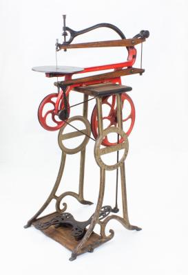 B67-229 TREADLE OPERATED SCROLL SAW. Seneca Mfg. Co. Rival. Designed by Seneca for amateur and light work. 16" x 15" by 41" high. Has the drilling attachment but missing the pulley belt to drive it. Original paint 80%, has its blade and the saw works smoothly. The date of Lewis's patent for the tilting table is cast into the side.
