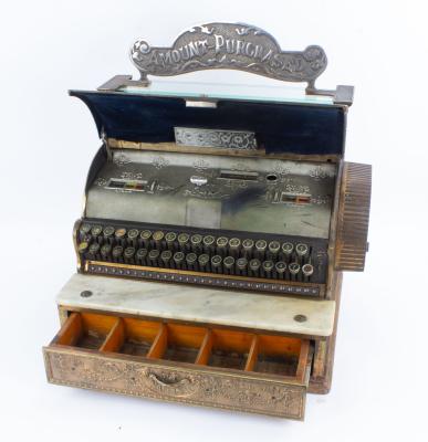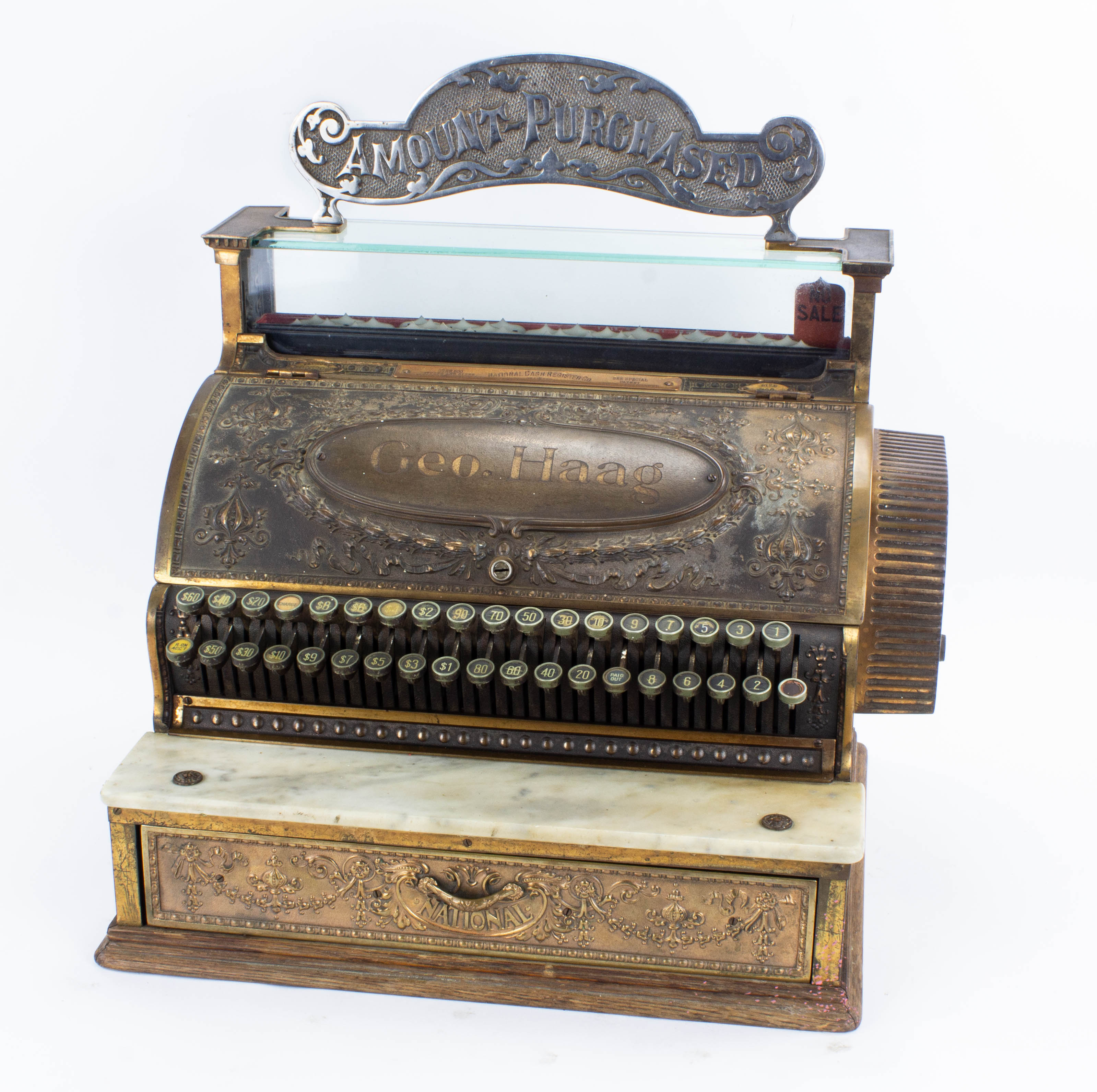 B67-232 CASH REGISTER. National Cash Register No. 366. Solid brass on oak base with marble shelf, drawer type mechanism, Dolphin casting. Mechanism works to open the drawer but probably needs some work. Tape printer on right side. Glass intact and clean. Includes "Amount Purchased" headpiece; fits the holes but nickel plated. Marked "Geo. Haag" on front. Extremely heavy so be prepared to pay extra for shipping if bidding absentee. From the collection of Harold Unruh. Good+ 1000-2000