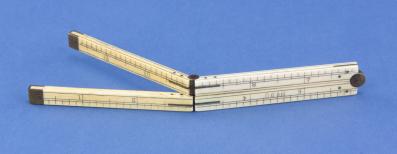 B67-244 IVORY FOLDING RULE. Stanley No. 90. Fourfold, one-foot, narrow unbound rule, round hinge. Not marked by Stanley as was typical. Ivory overall very clean with some light yellowing. Missing one face pin. Good+ 80-160
