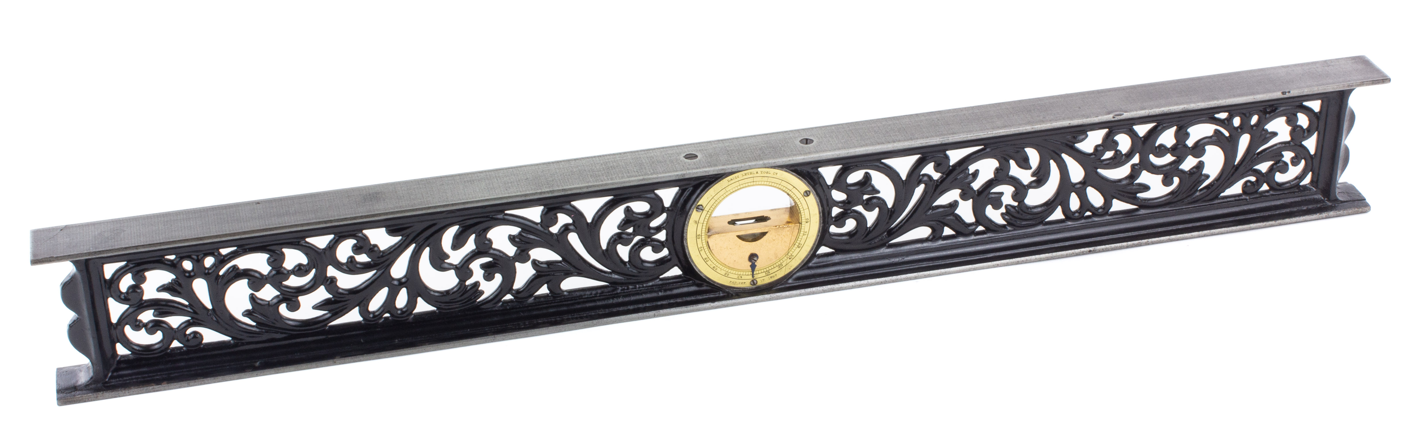 B67-264 CAST IRON INCLINOMETER. Davis Level Tool No. 4. Transitional version between L.L. Davis and Davis L&T; it has the standard height and no gold highlighting, but the heavier web casting of the L.L. Davis models. 24", japanning repainted, brass polished, one corner is cracked but not broken off. Good 100-200