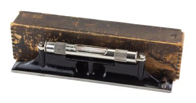 B67-269 MACHINIST LEVEL. Starrett No. 98 IOB. 12" version with rotating vial protector, shafting groove Japanning is near perfect with a couple of small chips, nickel plated vial holder is immaculate. Sliding lid wooden box is worn but intact with original lid, label worn but legible. Fine 100-200