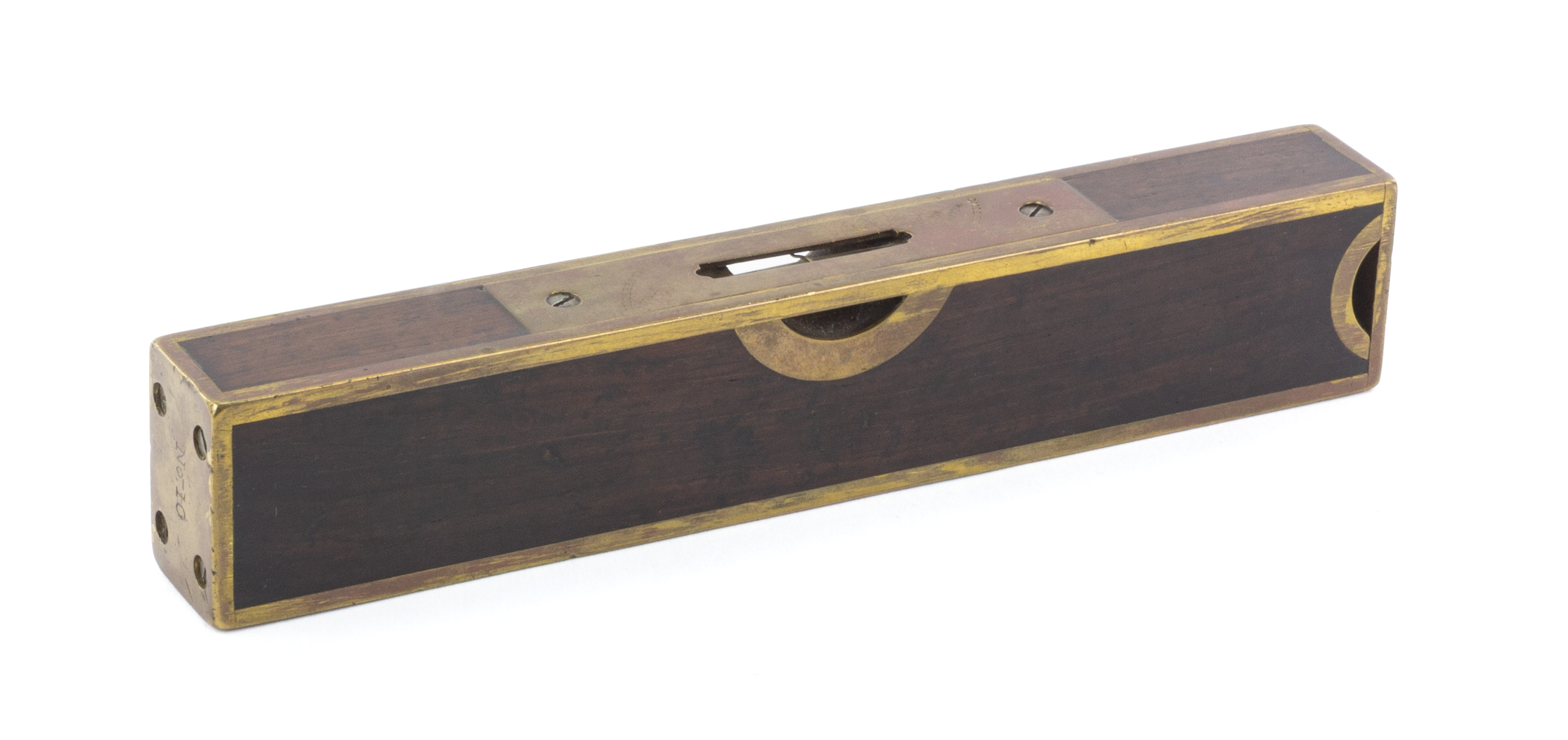 B67-274 BRASS BOUND MACHINIST'S LEVEL. Millers Falls No. 10. Manufactured by MF after the Stratton Bros. patents expired, and virtually identical to the Stratton No. 10 except for the plumb vial adjustment. See Rosebrook, pages 99-100. 10" long, rosewood and brass near mint, vials original and wet. Fine 200-400