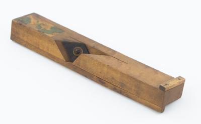 B67-284 CIGAR SPILL PLANE. H.W. Yates. 9-1/2" long with skewed cutter to produce spills, usually from cedar, to be used to light a cigar. Partially legible green label. From the collection of David Jeffers. Good 60-120