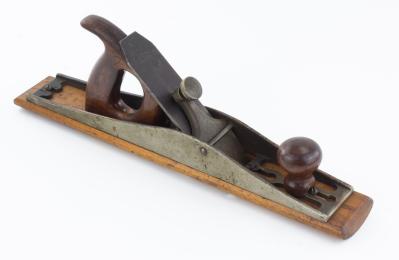 B67-286 INTERCHANGEABLE SOLE PLANE. Unmarked and probably made by a patternmaker for his own use. 15-1/4" long plated brass with three slots to attach the sole, closed tote and slip-in lever cap. Comes with only one sole (marked "2") and matching Sandusky cutter. From the collection of Harold Unruh. Good 60-120
