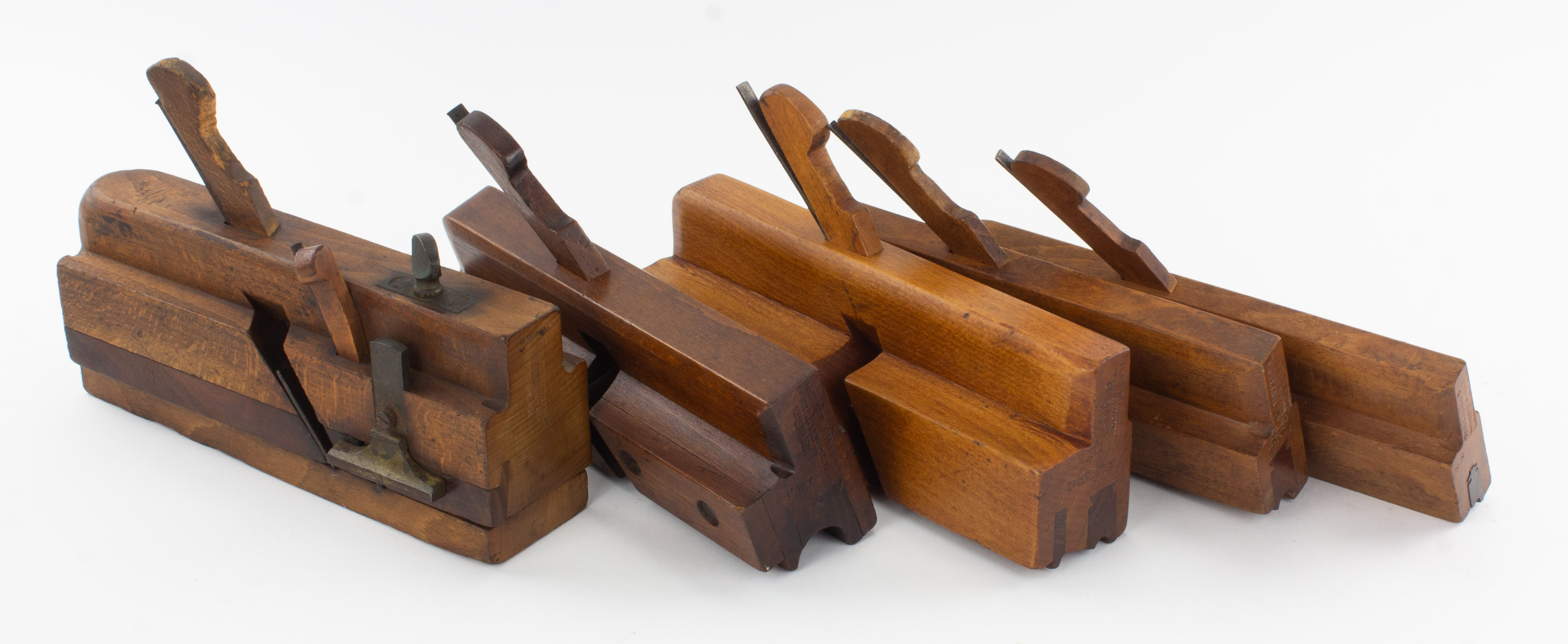 B67-287 LOT OF FIVE MOLDING PLANES. Israel White. One moving filletster, three side beads, and one complex moulder with quirk ovolo and astragal. All very clean, noting a few scratches and dings with elaborate lignum boxing. In addition, all are marked by the journeymen in the White plane-making shop who actually made the planes. The initials on the planes indicate that William McDaniel (WMD) made the moving filletster, Thomas Donoho (TD) made the half inch and the 1-1/8" beads, Nathan Norton (NN) made the 1/4" bead, and Frederick Miller (FM) made the complex moulder. All four of these journeymen went on to make planes bearing their own names. A superb collection. From the collection of Steve Dice. Fine 200-400