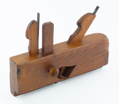 B67-289 DADO PLANE. Kieffer & Auxer. Applewood, 9-1/2" sole with 7/8" skewed cutter and separately wedged double nicker, tombstone depth stop with hand carved locking thumbscrew. Kieffer was Emmanuel Carpenter's son in law, and formed the partnership with Auxer to take over the business from Carpenter's widow. Very clean and well made. Good+ 100-200