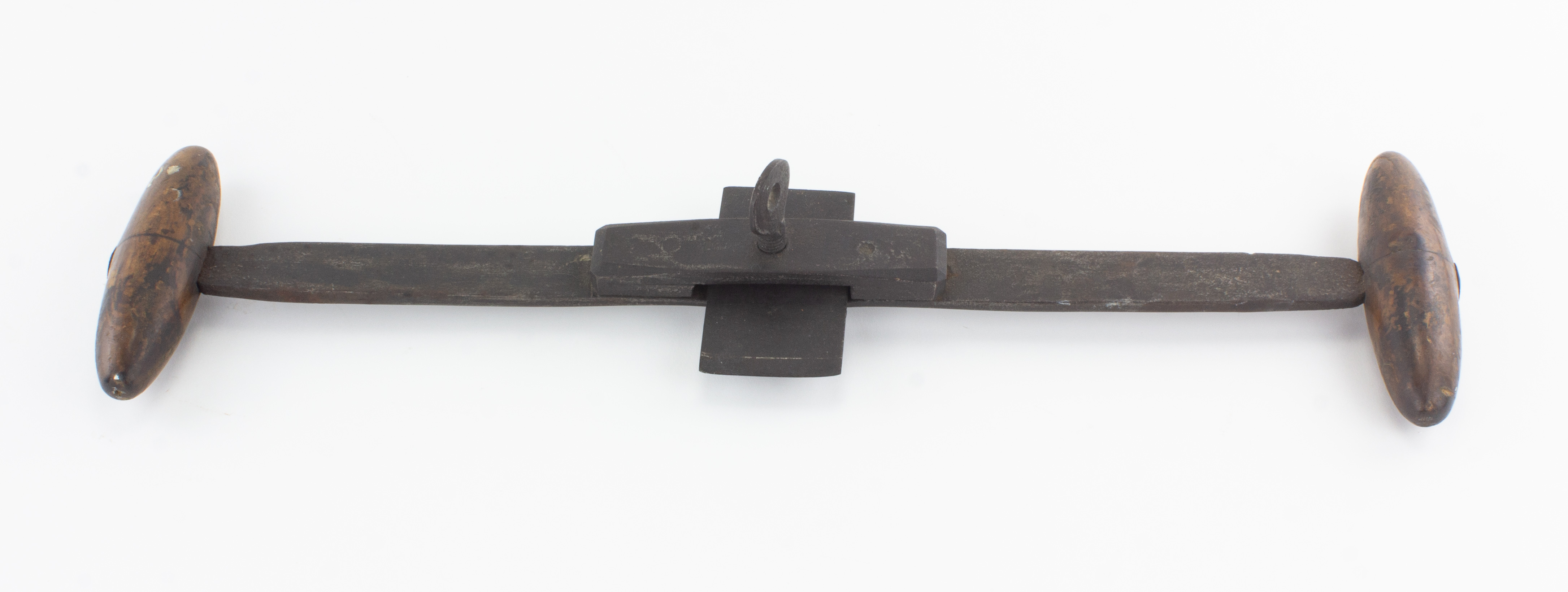 B67-298 DRAW SHAVE. 21" across with a 2-1/8" double ended cutter, held in the middle by a handforged thumbscrew, wooden football-shaped handle on each end. Metal oxidized but no rust or pitting, small crack in one handle and paint splotches on other. Good 50-100
