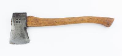 B67-305 FOURSQUARE HATCHET. Stanley. 3-1/2" edge, head has Foursquare logo cast on one side and sweetheart mark on other. 16" original hickory handle with chip at end. Head is used but clean and sharp. From the collection of David Jeffers. Good+ 100-200
