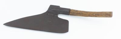 B67-306 GERMAN GOOSEWING AXE. Rare "hump-back" form with 15-1/2" left-handed blade, uncommon "pentagram" decoration with additional decoration and two maker's marks (FJ). Original 10" offset handle with some inactive worm. Light overall oxidation but no damage. From the collection of John Henson. Good+ 100-300