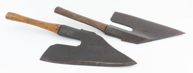 B67-308 SET OF RIGHT AND LEFT HANDED GOOSEWING AXES. William Addam. Matched set of Pennsylvania goosewings. Each has 15" blade and W. Addam name surrounded by four starburst marks. Each has an original 10-1/2" offset handle; the one on the left-handed axe is loose from the head and has some inactive worm and a tight check. Metal is very clean, oxidized but no corrosion. Addam is listed as an axe maker in the EAIA directory without working dates but these are clearly early. From the collection of John Henson. Fine 500-1000