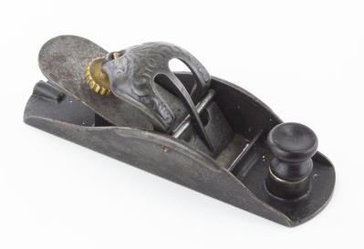 B67-316 SHOEBUCKLE BLOCK PLANE. Stanley No. 110. Type 2C, japanning mostly worn off the sides, 60% on the bed, J mark on cutter, original knob. Metal clean, a few small chips in throat. Good 100-200