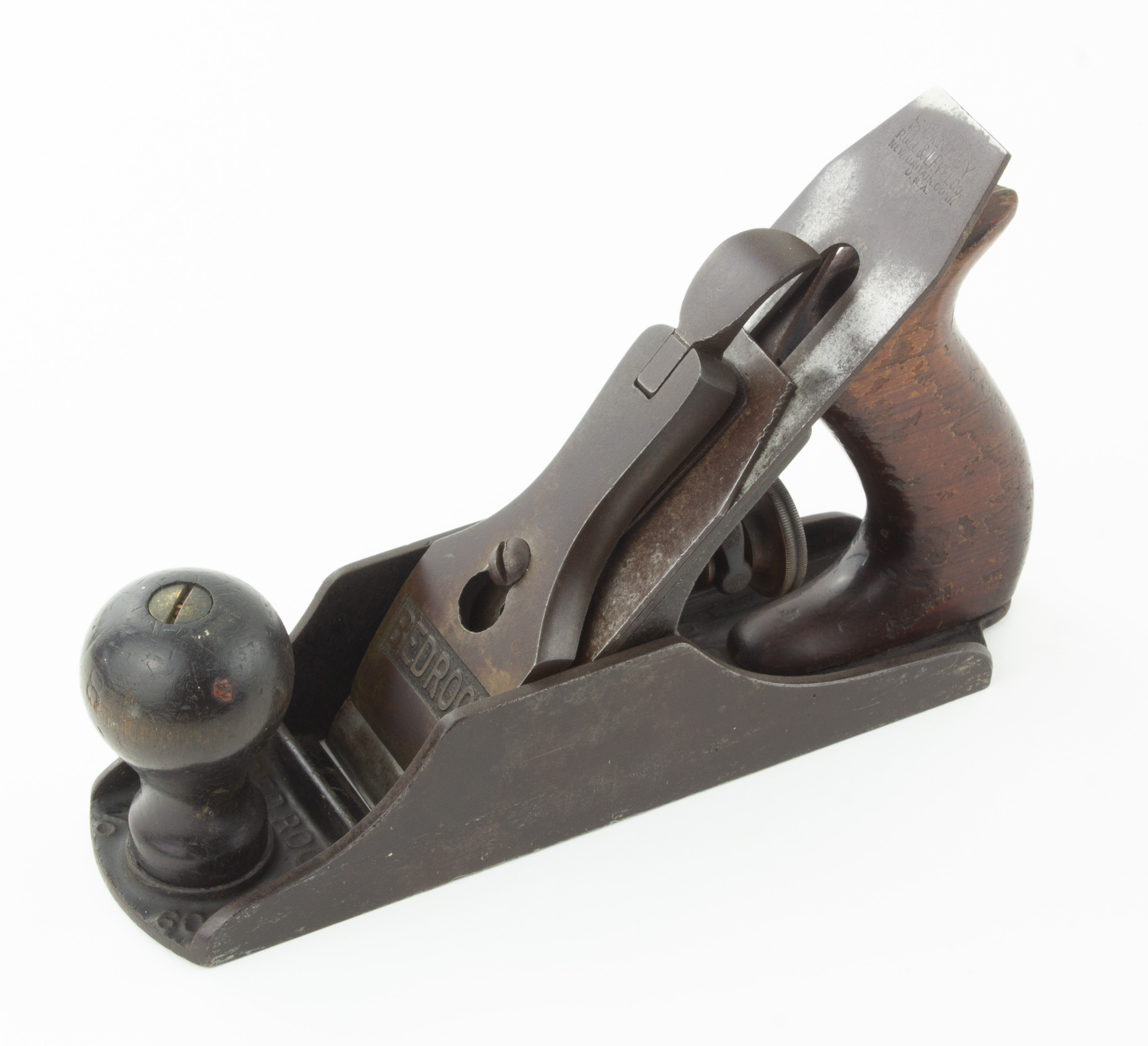 B67-317 NUMBER TWO SIZE PLANE. Stanley Bedrock No. 602. Type 6 with a T-mark cutter, varnish on tote is worn but no cracks or chips, metal overall oxidized, nickel plating worn off lever cap. Good 250-500