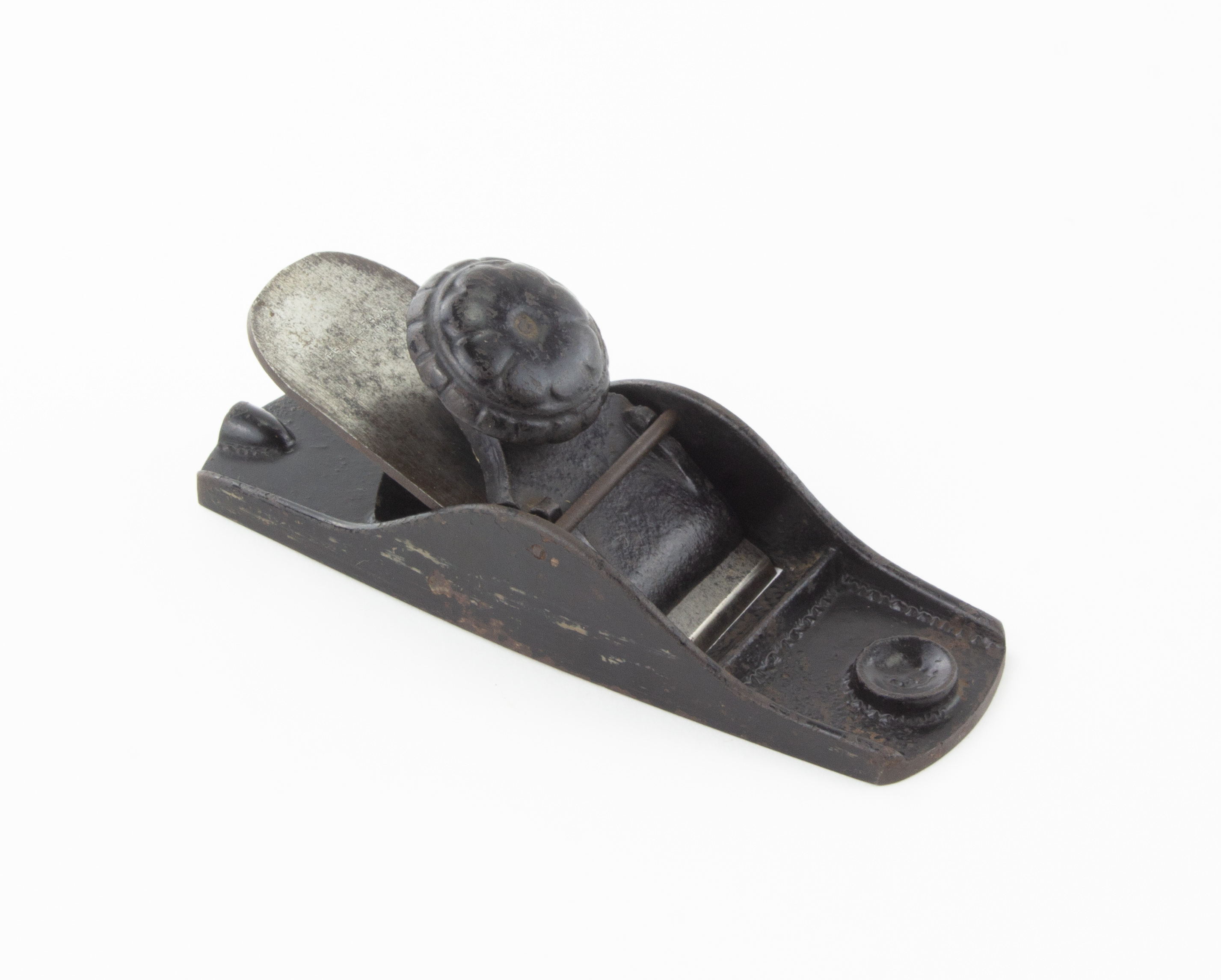 B67-319 BLOCK PLANE. Brattleboro Tool Co. Looks like plane in Figure 248 in PTAMPIA I. Proper marked cutter, 5-1/4" sole, japanning 80%. Light surface oxidation on sole and cutter but overall clean. Good 100-200
