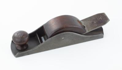 B67-324 LOW ANGLE SMOOTHING PLANE. Unmarked but looks manufactured, heavy iron casting with 10-1/4" sole, 2" Ohio Tool Co. cutter that looks like it's been cut down to fit. Has slip-in wooden wedge with one large ding, wooden knob. Metal clean, japanning 90%. From the collection of Harold Unruh. Good 100-200