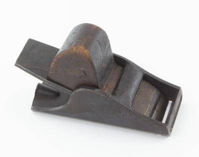 B67-327 BULLNOSE BLOCK PLANE. A. W. Kindred & Co.(?) Very similar to casting of plane in PTAMPIA I, Fig 186A but looks like the toe has been cut off to make it into a bullnose, edges of sole are beveled, bulbous wooden wedge. Cutter marked A.L. Whiting & Co., which Kindred often used in his planes. Light overall wear but no damage. Unusual. From the collection of David Jeffers. Good 100-200