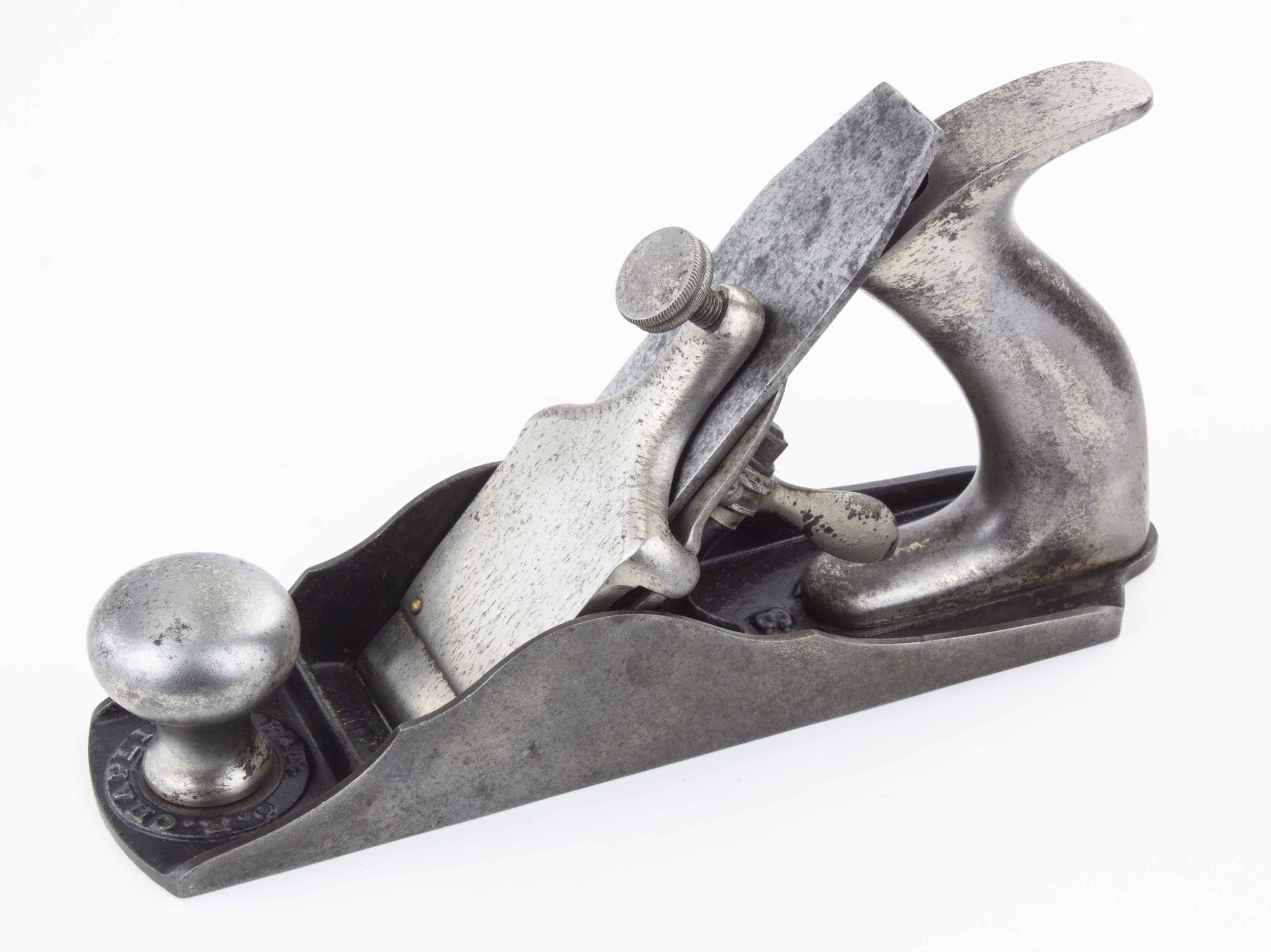 B67-336 SMOOTHING PLANE. Chaplin Patent No. 3. 8" sole, 1-3/4" unmarked cutter, nickel plated tote and knob. Japanning 90%, plating 80%. Overall light oxidation to metal but no rust or pitting. From the collection of Harold Unruh. Good 125-250