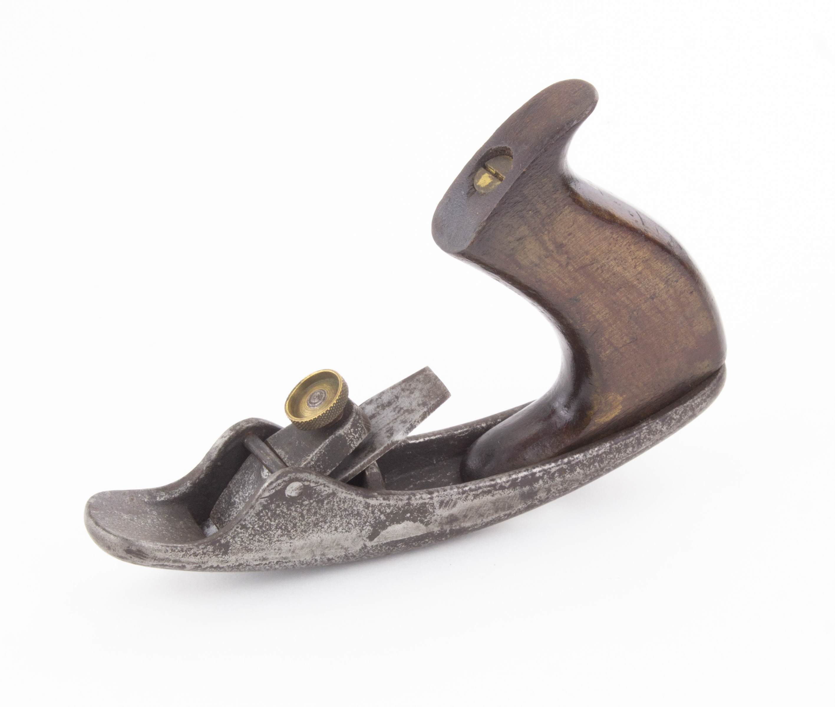 B67-338 FINISHING PLANE. Reeder Patent. Cast iron body with 6-1/2" sole that is compassed both lengthwise and widthwise, unmarked cutter. Metal has overall oxidation and a few patches of surface rust but overall clean. It is identified in PTAMPIA I, Figure 164, as an example of Isaac Reeder's 8/2/1881 patented "one hand" plane, but with longer sole and fixed tote in place of the swiveling handle shown in the patent drawings. From the collection of Steve Dice. Good+ 300-600