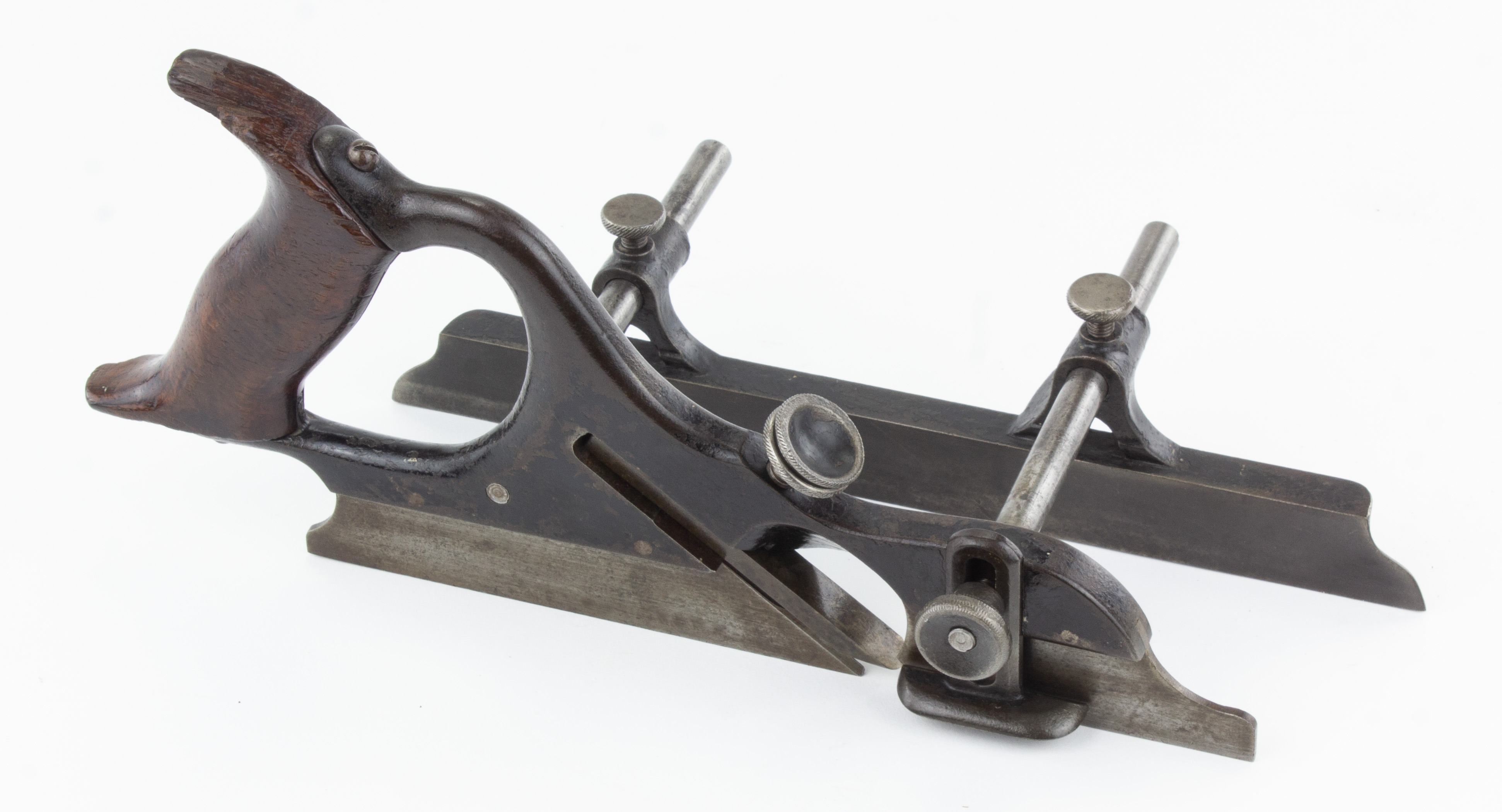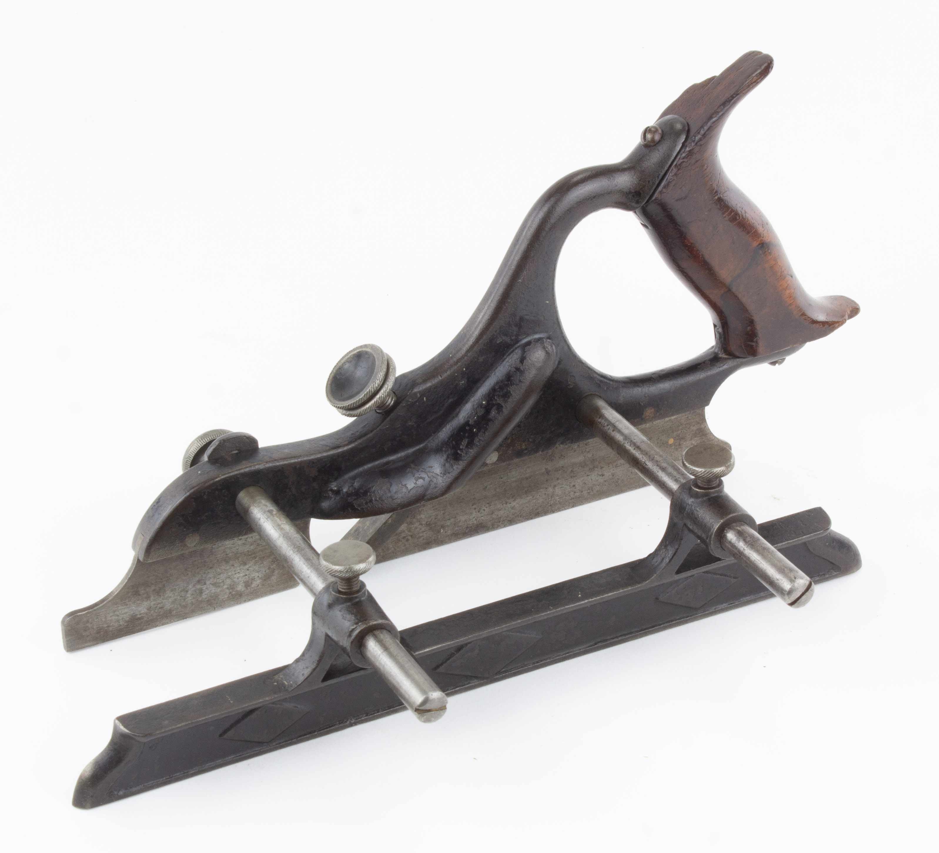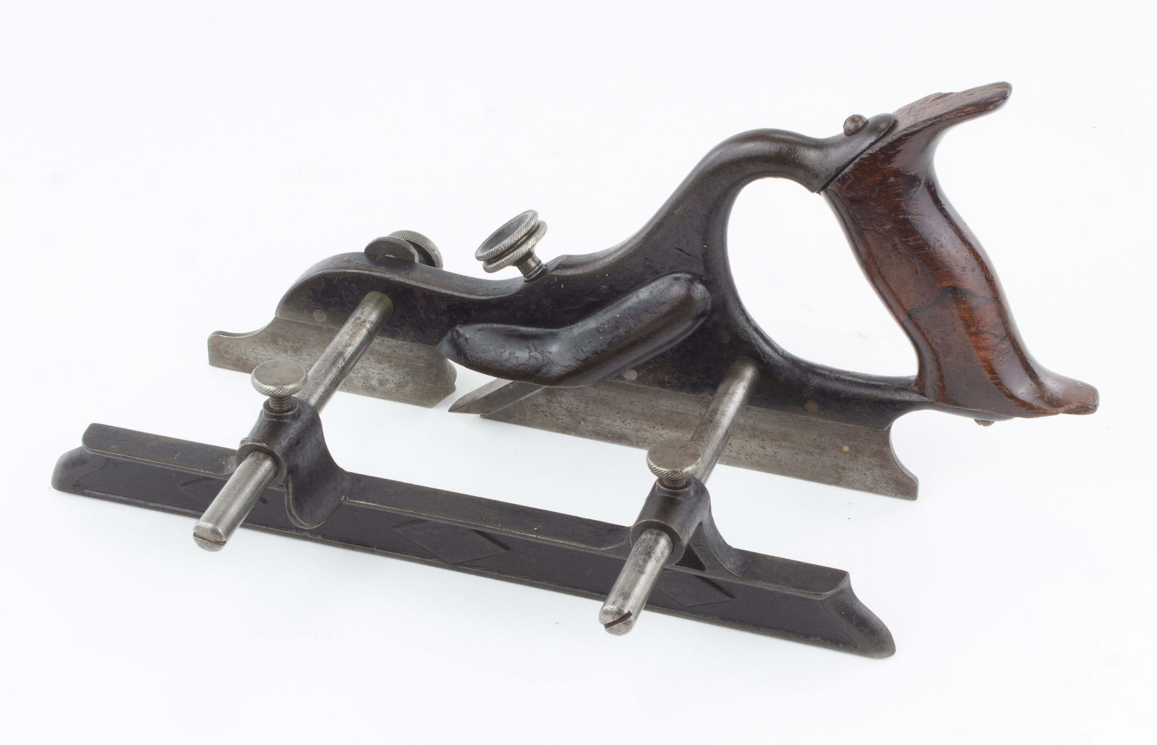 B67-340 IRON PLOW PLANE. Metallic Plane Co. Very rare plow plane with the diamond pattern fence, identical to plate 215 in PTAMPIA I. Chips from both horns of the rosewood tote, japanning 70%. No cutter and japanning mostly worn off, light pitting on skate, one fluting cutter. Good 300-600