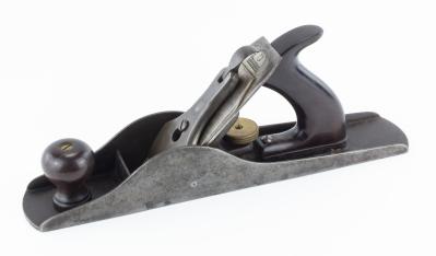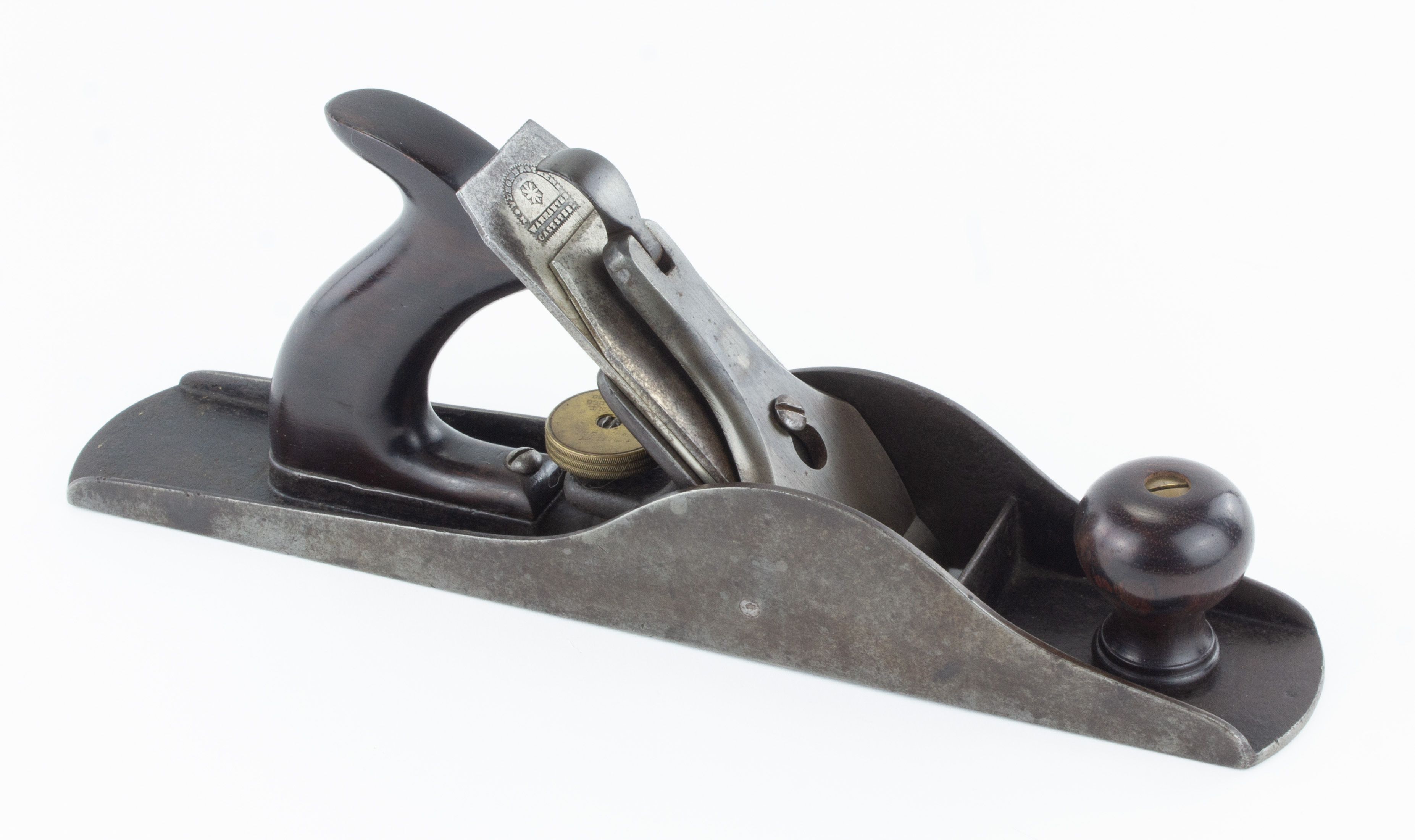 B67-344 JACK PLANE. Bailey Vertical Post. Good clean example of the design manufactured by Leonard Bailey in Boston in the 1860s before his association with Stanley. No. 5 size, 13-1/2" sole including, 2" Moulson Bros. cutter. Early type lever cap without the spring. Tote and knob are like new but if replacements they're very well done. From the collection of Harold Unruh. Fine 1000-2000