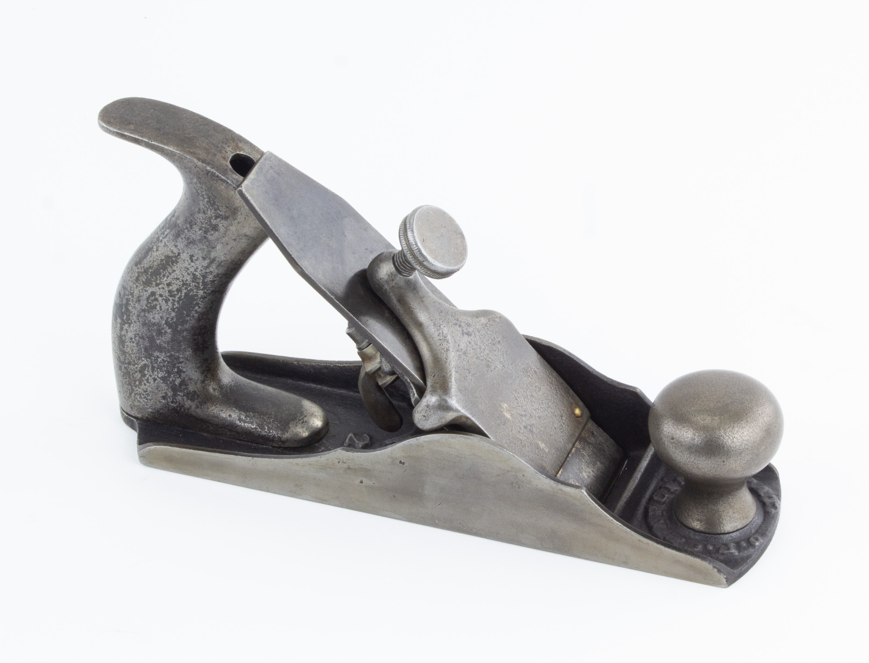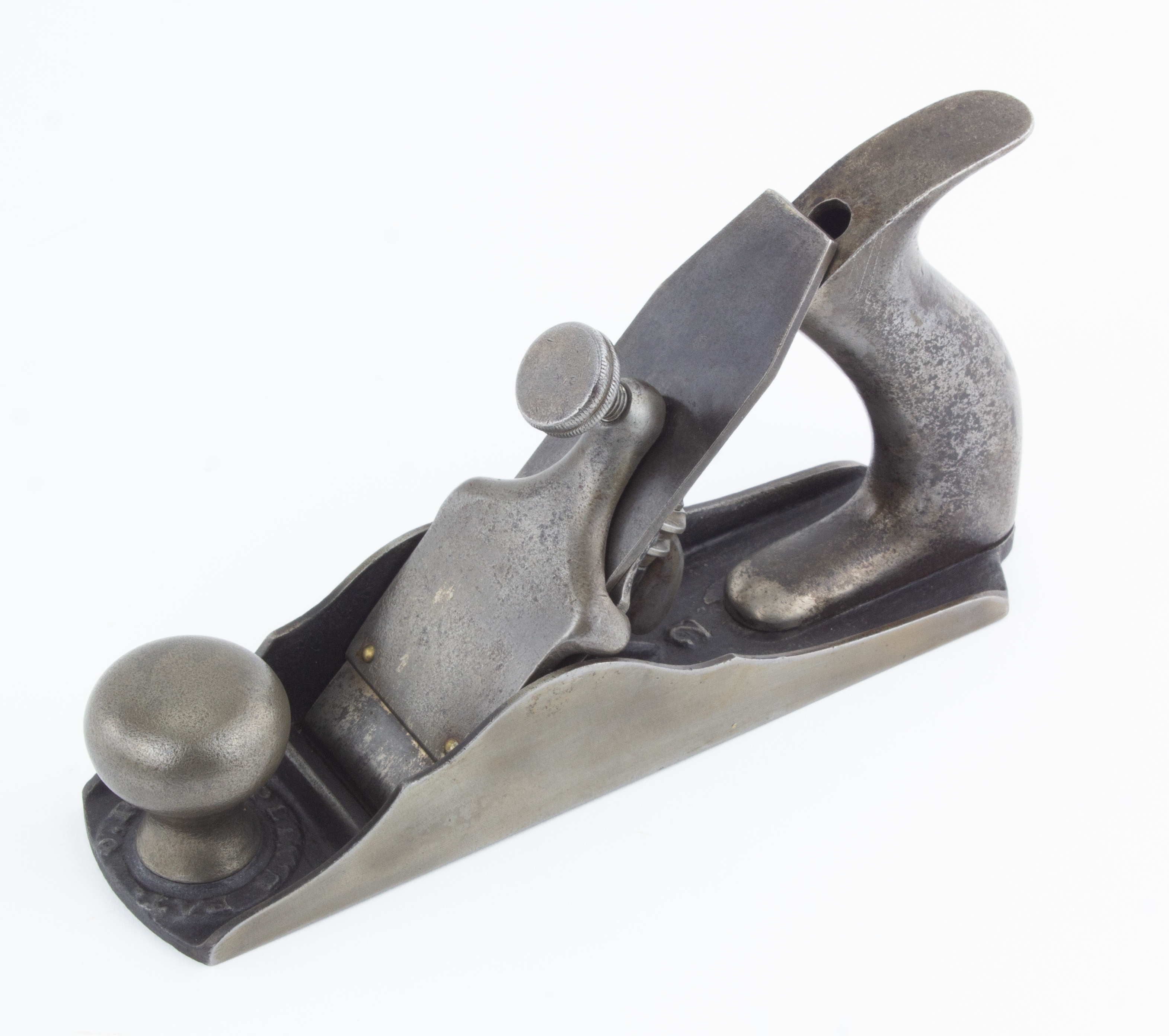 B67-347 NUMBER TWO SIZE PLANE. Chaplin Patent No. 2. 7" sole with "2" cast behind frog, iron knob and tote, 1-1/2" cutter unmarked but appears original. Japanning 60%, nickel plating mostly worn, clean with all original parts. From the collection of Harold Unruh. Good+ 1000-2000