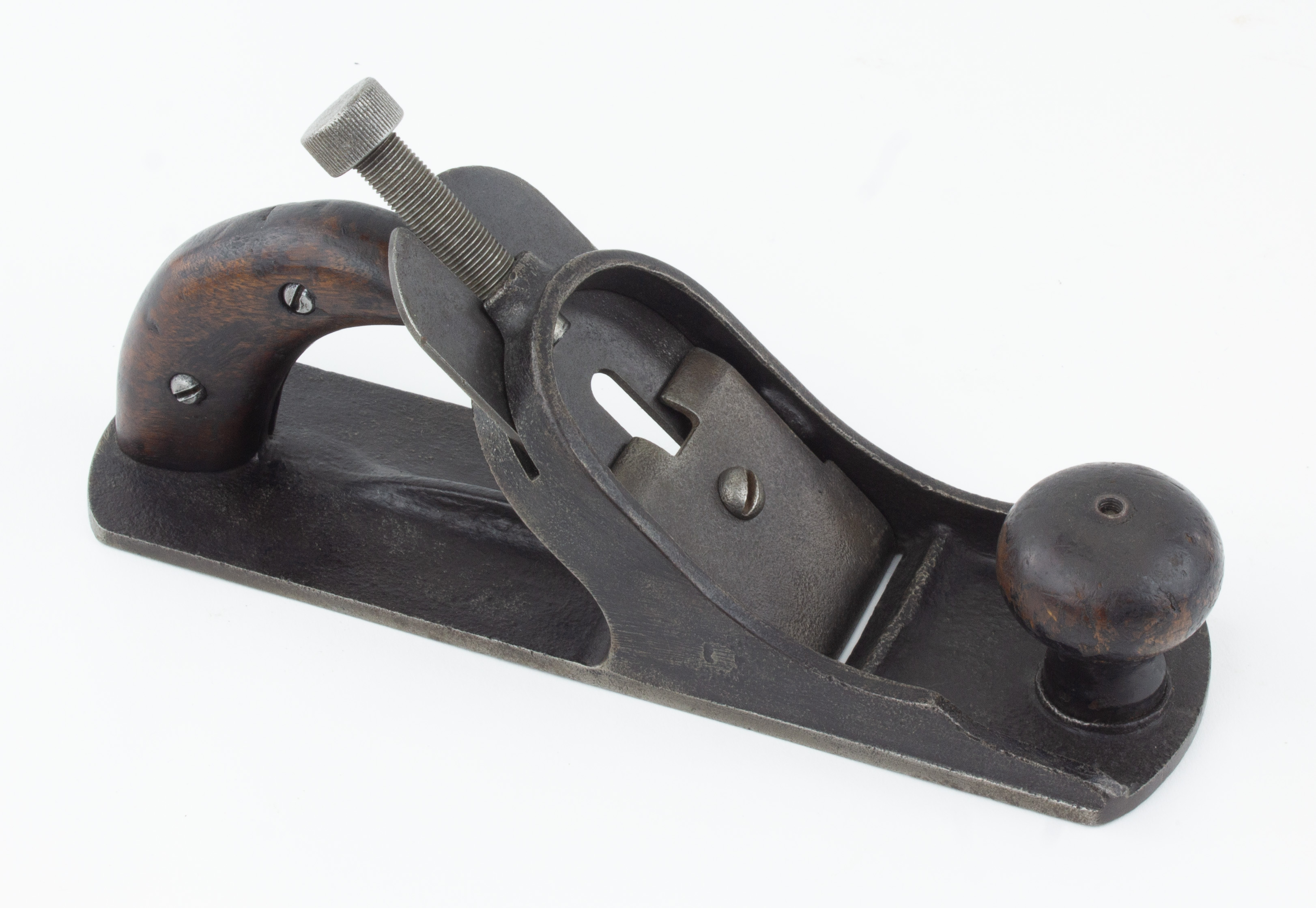 B67-349 SMOOTHING PLANE. Challenge. The Challenge Plane was patented by Arthur Goldsborough, manufactured by Ivor Johnson and sold by Tower & Lyon. This is the 9" smoothing plane version that has the word "Challenge" and Goldsborough's patent dates cast into the yoke. Wood and metal both worn but with no significant damage, black paint about 50%. From the collection of Harold Unruh. Good+ 1500-3000