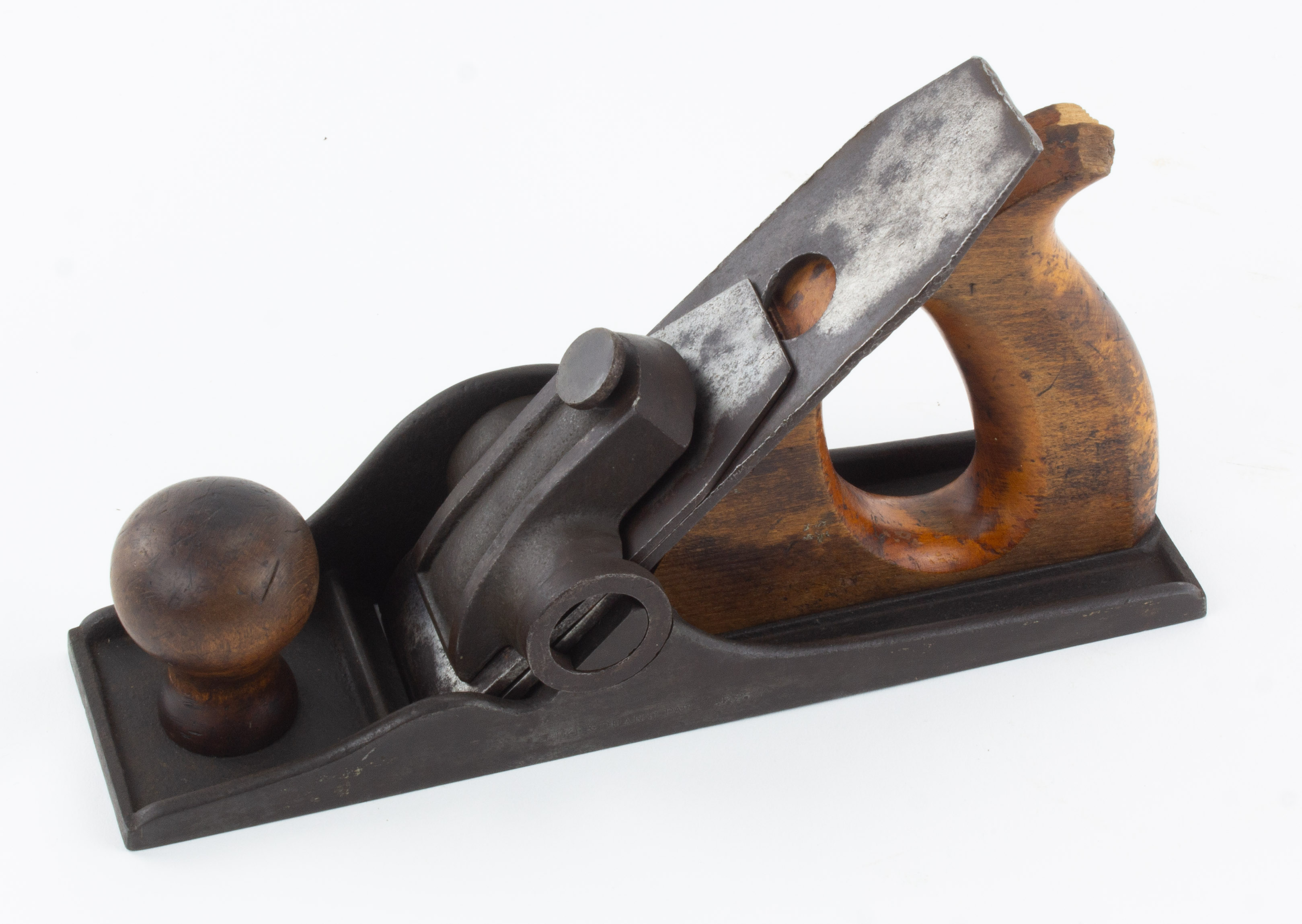 B67-351 SMOOTHING PLANE. Pike & Dean No. 103. Patented in 1875 by Asahel Dean of Philadelphia and sold by Pike & Dean. PTAMPIA II, pages 152-53. The lever cap has ring hook on the left cheek, which was alleged to make it easier to replace the cutter. 9" sole, 2" unmarked cutter, slightly spalled. Marked on left cheek. Chips from the end of the tote and wood has wear but no other damage, metal oxidized. The shorter length Pike & Deans are particularly hard to find. From the collection of Harold Unruh. Good+ 1500-3000