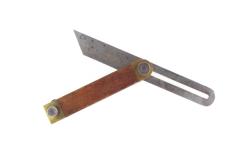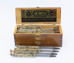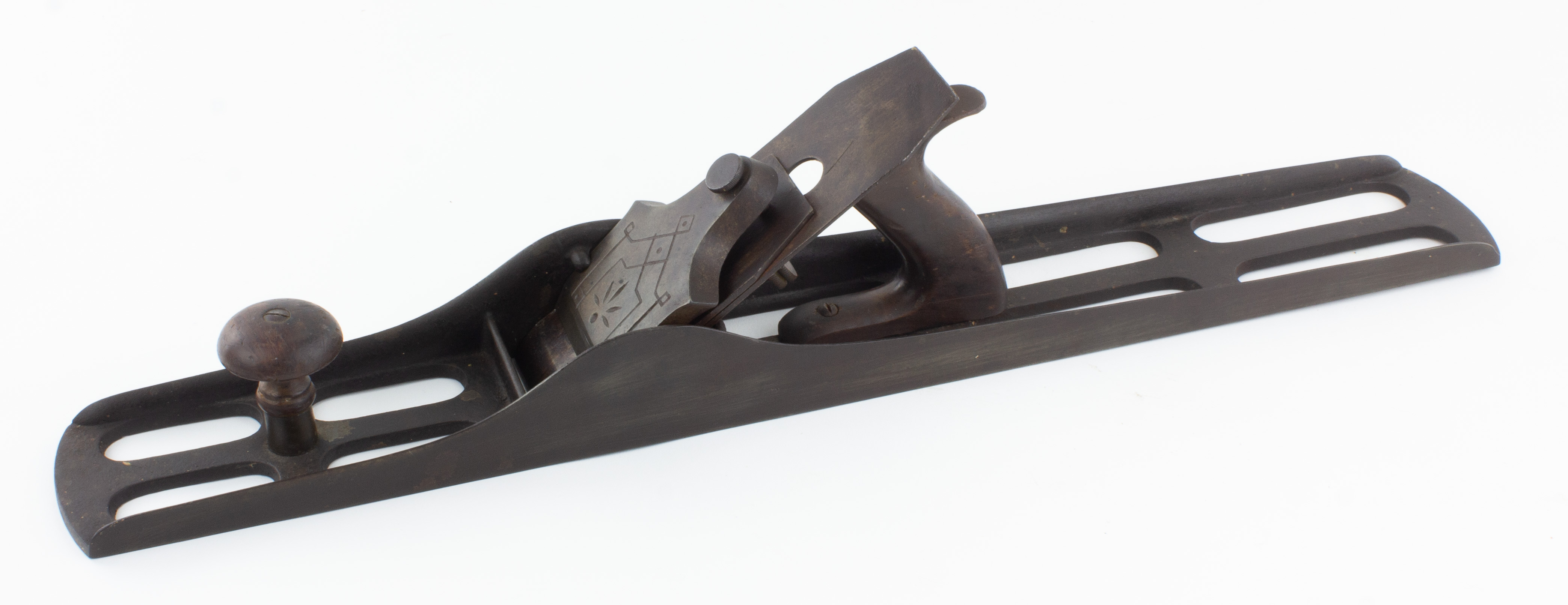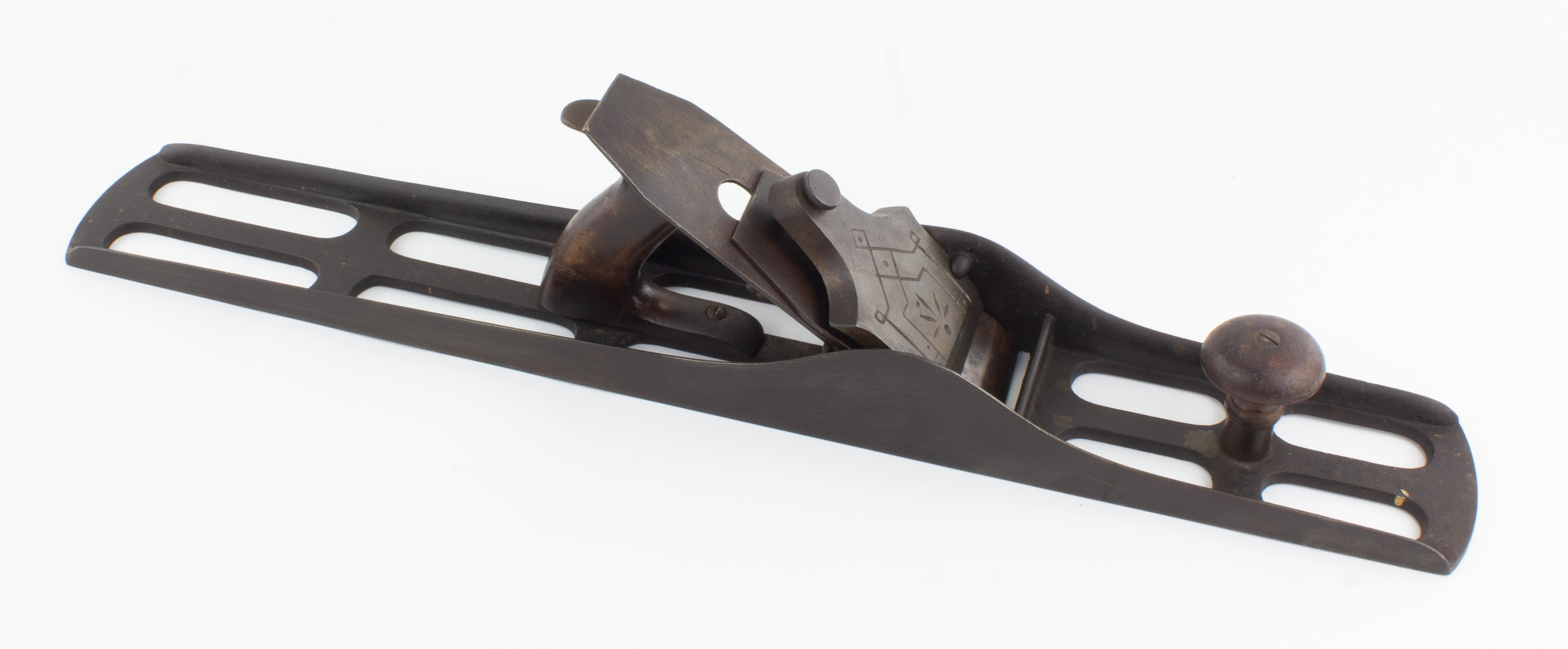B67-352 JOINTER. Hardy Patent. Patented by Cyrus Hardy in 1872 and sold by the Boston Metallic Plane Co., the large holes in the sole were supposed to reduce weight and friction. The cutter with the bent-down end that should engage a slot on the cutter adjustment has been replaced with a more conventional unmarked cutter which needs to be adjusted manually. The tote has a well reglued tip, wood otherwise decent with a few scratches. Metal is oxidized but without rust or pitting. Original lever cap with its geometric pattern, but nickel plating mostly gone. A decent example of a very rare plane that will display well, if you can get past the improper cutter. From the collection of Harold Unruh. Good- 150-300