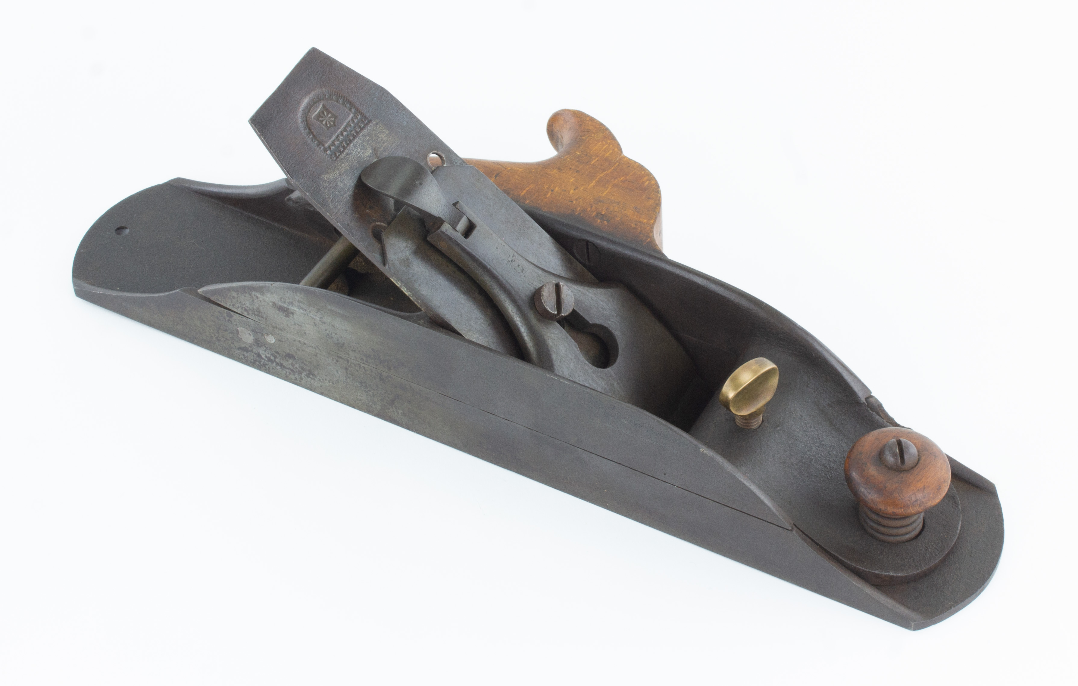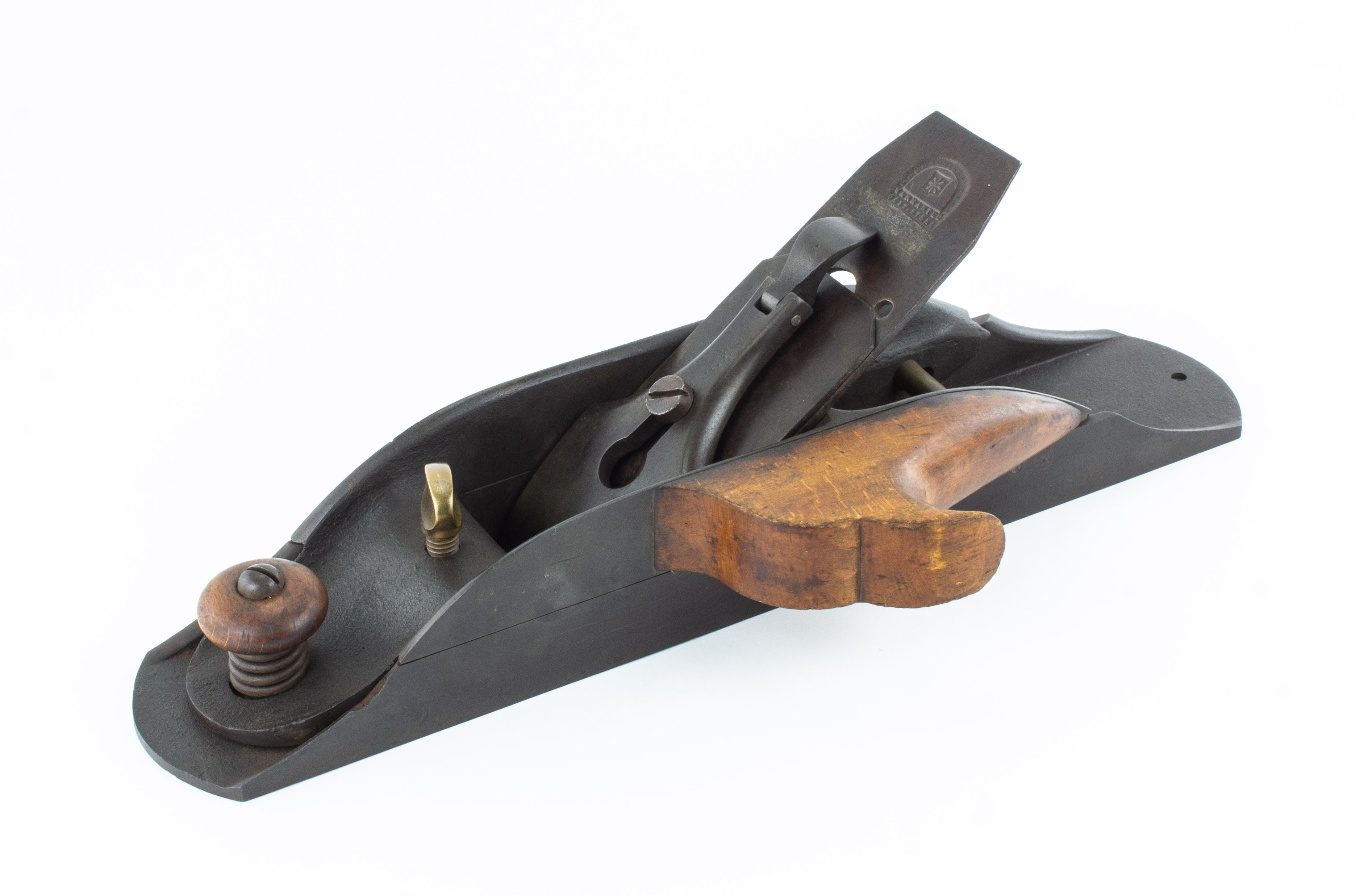 B67-353 SHOOT BOARD PLANE. Bailey Split Frame. Series D split frame with the cam-locked lever cap, early type without the banjo spring, knob attached with a machine screw screwed into a raised boss on the frame. The 2-1/2" Moulson Bros. cutter has two holes tapped into it which don't serve any obvious function. 16" sole. Wood very clean, metal is oxidized but with no rust or pitting. The shoot board is the rarest configuration of the split frames; there's a Series C example shown in Figure 1-26 of Van Pernis & Wells, but this is the first Series D we've seen. From the collection of Harold Unruh. Good+ 2000-4000