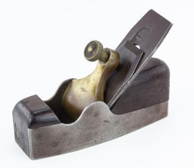 B67-359 INFILL SMOOTHING PLANE. Spiers No. 5. 7-1/2" cast iron body with tapered sole, rosewood fill, gunmetal lever cap with small "Spiers Ayr" mark. 2-1/8" Marples iron. Wood has some minor scratching but no damage, metal clean and never polished. Includes an old green felt bag, worn with some holes but intact. Good+ 200-400