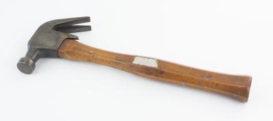B67-374 DUO-CLAW HAMMER. A. Cripe Tool Mfg. Designed by Al Cripe in 1955, manufactured by Unicast and sold by the A. Cripe Tool Mfg. Co. See "The Improved Hammer", page 29. Head is unmarked, original handle with illegible decal and "BB No. 8514" stamped into the wood. Handle and head both very clean. From the collection of David Jeffers. Good+ 60-120