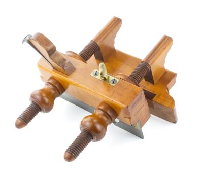 B67-406 UNHANDLED SCREW-ARM PLOW PLANE. J.B. Mack. Birch throughout, some scratches on nicely turned nuts but no splits, threads have a few small chips but almost entirely intact. Butcher cutter, slightly spalled. User name neatly stamped on toe. A mark (2 stars) from this Susquehanna, PA, maker in the 1830s. Fine 100-200