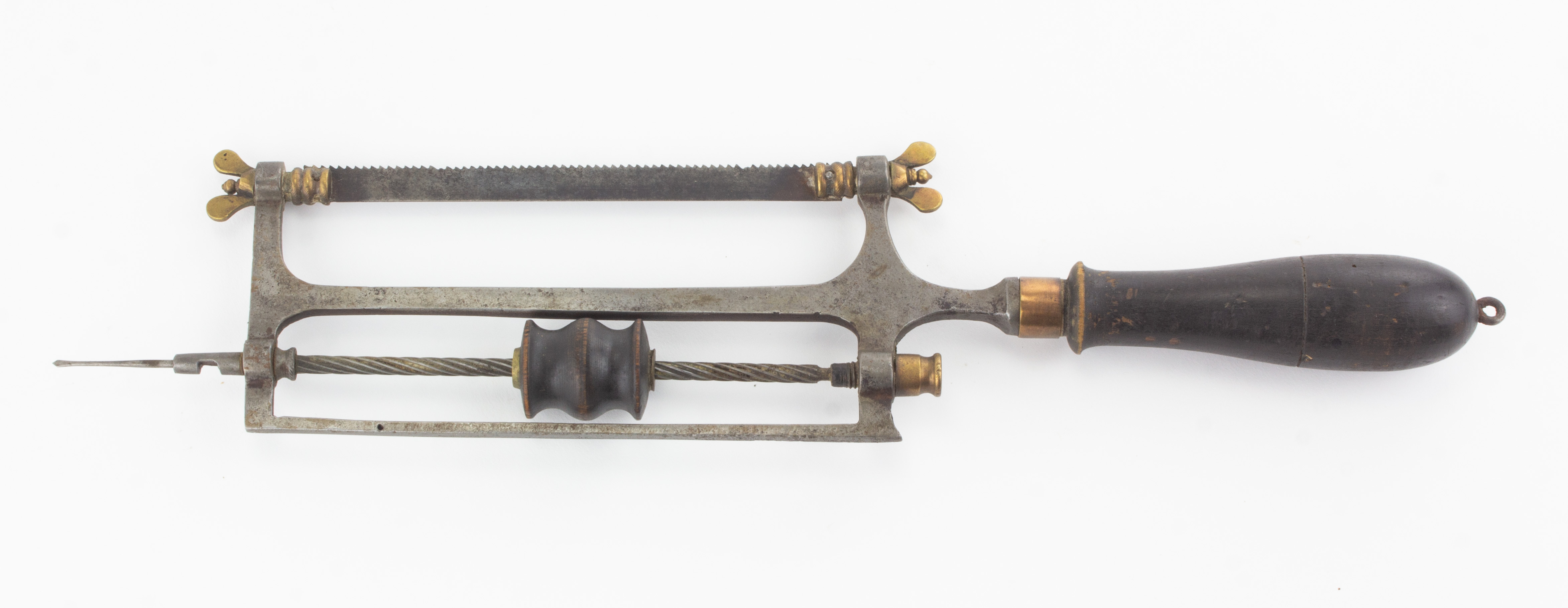 B67-412 COMBINATION SAW AND DRILL. Archimedian drill on one side and 5 inch hacksaw on the other. Ebonized handle, iron body with brass fitting. 15" inches overall including drill bit, screw eye in handle. We've seen a couple of these around but don't know who made them. From the collection of Jim and Christa Schoenky. Good+ 60-120