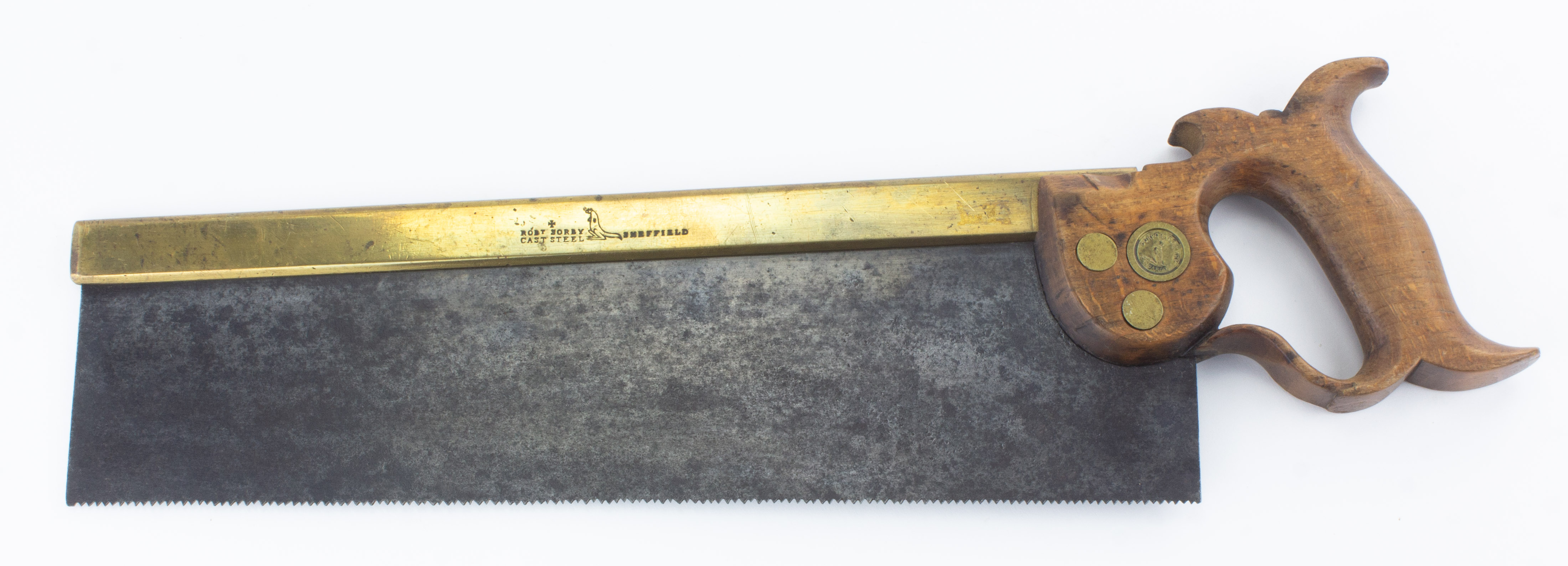 B67-415 BRASS BACK CARCASE SAW. Robert Sorby 120. 14" blade, lamb's-tongue handle with split nuts and original medallion, Sorby's "kangaroo" mark on back and medallion. Blade oxidized with a few small patches of light pitting; handle has a few chips and overall wear but no significant damage. From the collection of David Jeffers. Good+ 60-120