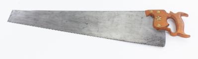 B67-417 STAR SAW. Wheeler, Madden & Clemson. Doesn't have the pointed handle design that was the subject of Millspaugh's 18874 design patent, but includes the brass star emblem with raised nut on reverse, and the etch is immaculate, reading "The Star Saw Wheeler, Madden & Clemson Will Pay Three Dollars for Every Inferior Saw of this Stamp Middletown NY." Blade is 28", rust free with nib, 4-1/2 ppi rip; applewood lamb's-tongue handle has one tiny chip from lower horn. From the collection of David Jeffers. Fine 500-1000