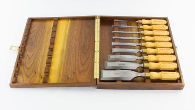 B67-420 BEVEL EDGE CHISEL SET. Robert Sorby. Nine total, between 2" and 1/8" in sizes, boxwood handles with brass ferrules, all marked. Appear new and unused. Inside 16" x 13-1/2" user made dovetailed box. Fine 500-1000