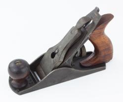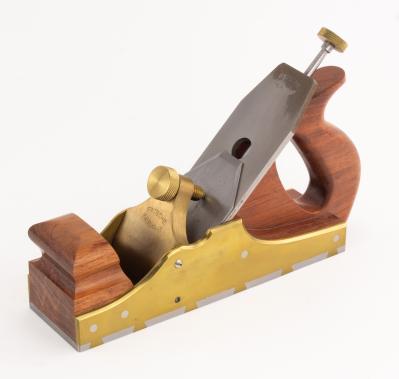 B67-426 MODERN MAKER INFILL SMOOTHING PLANE. Fritsche. German maker, brass body with dovetailed steel sole, 8-3/4" long, exotic hardwood fill and tote. Patterned after a Norris with a brass blade adjustment similar in style. Marked on both chip breaker and lever cap. From the collection of Bill Webber. Fine 125-250