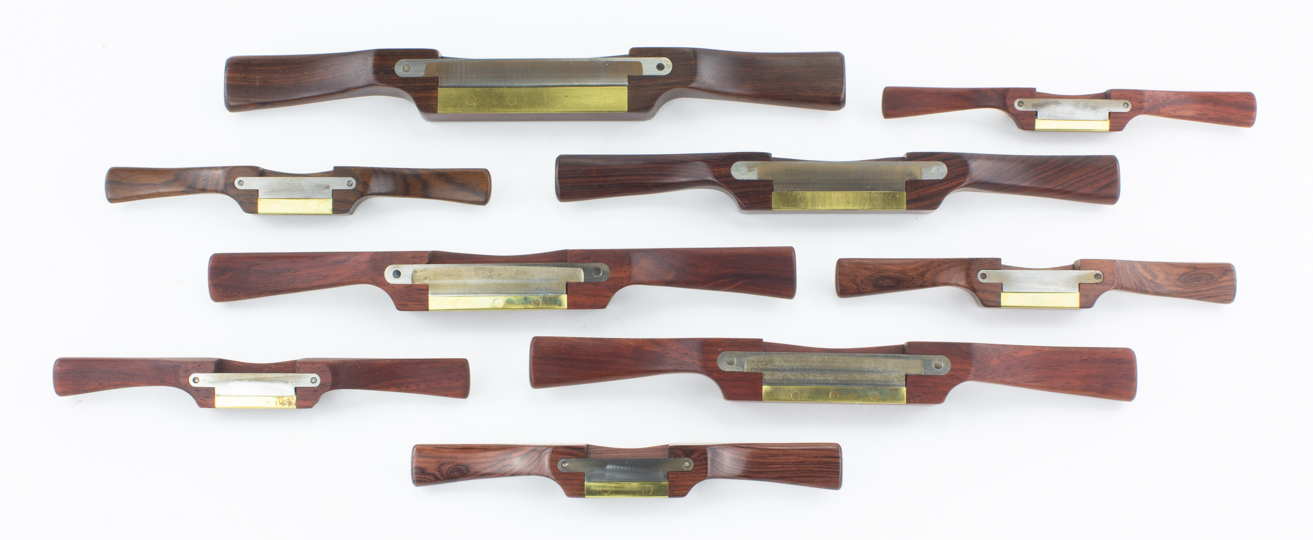 B67-427 SET OF OF NINE SPOKESHAVES. Unmarked and likely made by Bill Webber. Lengths are between 13" and 8" long with different hardwoods including rosewood and zebrawood, all with brass throat plates, cutters held by knurled brass thumbscrews. All look unused, very nicely made. From the collection of Bill Webber. Fine 150-300