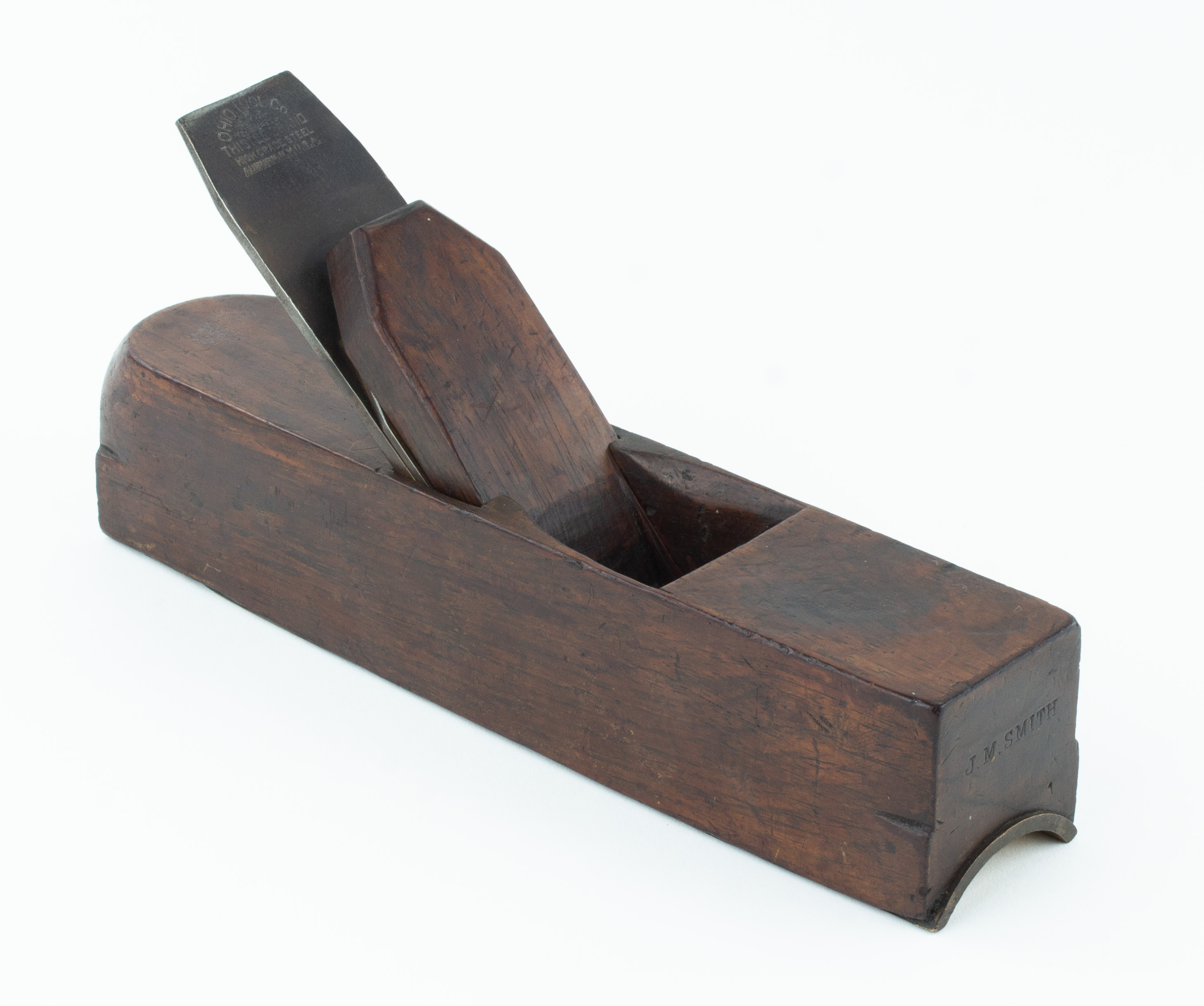 B67-429 FORKSTAFF PLANE. Brass sole. Rosewood body with concave brass-lined sole. 9-5/8" long, 1-3/4" Ohio Tool Co. cutter. User name at toe, a few holes in brass, one is threaded and missing its screw. Good 60-120