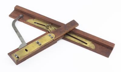 B67-446 BEVEL SQUARE. Unsigned, could be manufactured but looks like it was made by a talented craftsman with too much spare time. Two walnut arms, 8" and 12", with brass plates and a iron arm that can be positioned a different angles. Well made and intriguing. Fine 100-200