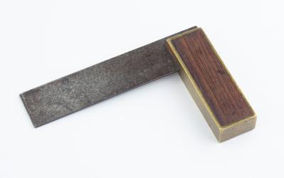 B67-450 IMPROVED TRY SQUARE. Type 1 Stanley No. 1. Not marked (other than with a user name) but appears to be the first version of Stanley's No. 1 improved model, which had a brass rather than cast iron framed handle with rosewood fill. Based on Traut's 1872 patent. 4" blade and 3" handle, in immaculate condition. Rare. From the collection of Steve Dice. Fine 800-1500